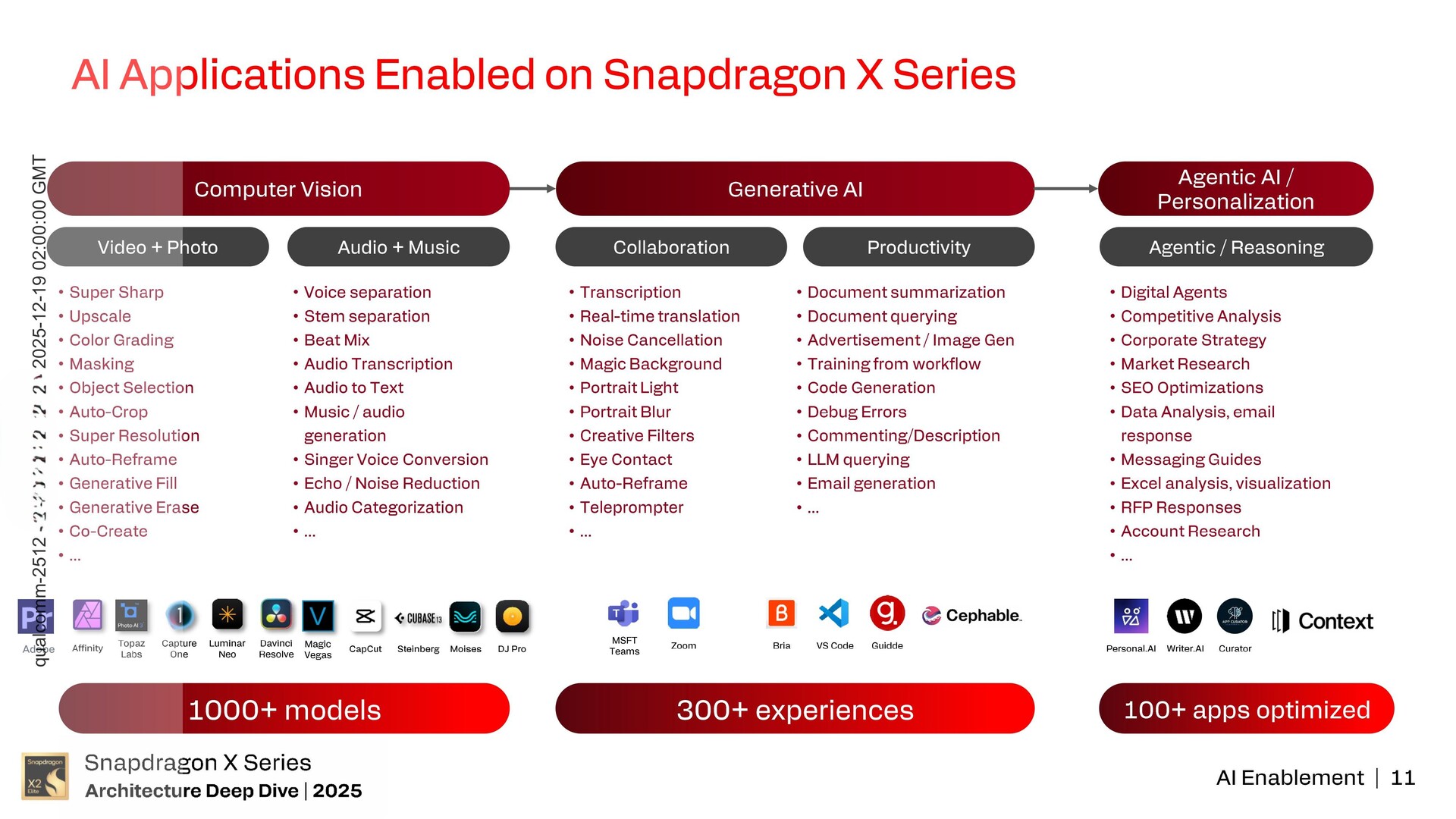 Las CPU para portátiles de la serie Snapdragon X SoC admiten actualmente más de 1.000 modelos y más de 300 experiencias que abarcan audio, vídeo, fotografía, IA generativa, IA agéntica y razonamiento.