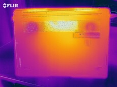 El desarrollo de la temperatura también se mantiene dentro de los límites. Sólo pudimos obtener un máximo de 41 °C en el lado superior del chasis y 46 °C en el lado inferior en el test de estrés con las herramientas FurMark y Prime95. Especialmente el MSI Prestige 14 se calienta notablemente aquí. Todo el chasis permanece cómodamente fresco a unos 24 °C en inactivo.