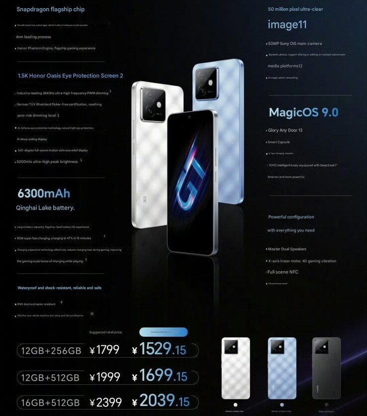 Otros aspectos destacados del teléfono incluyen hasta 16 GB de RAM y 512 GB de almacenamiento, clasificación IP65 y MagicOS 9.0 basado en Android 15. En cuanto al precio, el Honor X60 GT comienza en 1.799 CNY, unos 247 $, mientras que la configuración de gama alta con memoria y almacenamiento al máximo cuesta 2.399 CNY, unos 329 $.