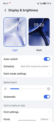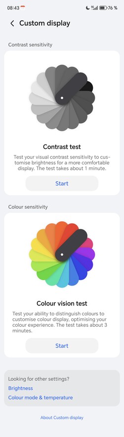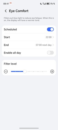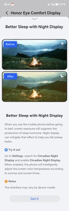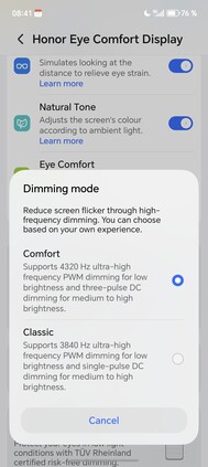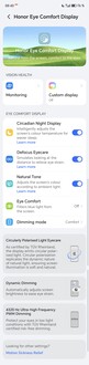 El punto de contacto central del Honor Magic8 Pro es la opción de menú "Honor Eye Comfort Display", donde se pueden controlar directamente todas las funciones adicionales. Además de la atenuación PWM de alta frecuencia, que puede funcionar tanto a 3.840 Hz como a 4.320 Hz con un brillo de pantalla bajo, también hay funciones comunes como "Tono natural", que ajusta los colores de la pantalla a la luz ambiente. El resultado es una pantalla más cálida, ya que se reduce la proporción de luz azul. La "Pantalla nocturna circadiana" funciona de forma similar, diseñada para reducir la supresión de las hormonas del sueño por la noche. También hay un modo oscuro configurable para que la pantalla muestre el contenido en un tono más oscuro por la noche, que la mayoría de los demás smartphones de Android también ofrecen.
