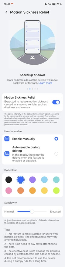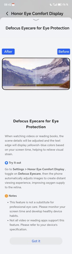 Otra función específica de Honor es "Defocus Eyecare", que simula la mirada a lo lejos para aliviar la fatiga ocular y es compatible con más de 2.000 aplicaciones. El Magic8 Pro también puede aliviar el mareo causado por el movimiento al viajar en un vehículo. En el borde de la pantalla aparecen bolas de colores que se mueven con la aceleración del vehículo. Con ello se pretende reducir los posibles mareos o náuseas. En la práctica, ha funcionado sorprendentemente bien.