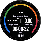 En el modo de entrenamiento de carrera (al aire libre), puedes competir con un "compañero inteligente" y permitirle establecer un ritmo fijo o establecer automáticamente tu mejor rendimiento anterior. Durante el entrenamiento, el Reloj te mantiene informado sobre la ventaja o el retraso. Lassiguientes pantallas del Reloj ilustran la visualización del entrenamiento durante la carrera con un compañero inteligente activado.
