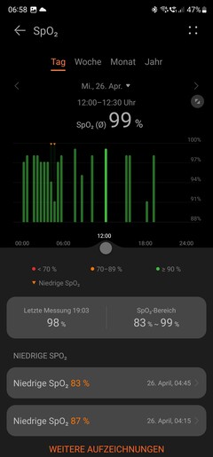 El smartwatch de Huawei detecta con fiabilidad las fases del sueño y las horas de vigilia y parece básicamente plausible. Se distingue entre sueño ligero, profundo y REM. También se determina la calidad de la respiración durante el sueño. Los datos del sueño se pueden utilizar para una función de alarma inteligente si se desea, y opcionalmente se pueden grabar sonidos como voces o ronquidos durante el sueño.