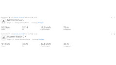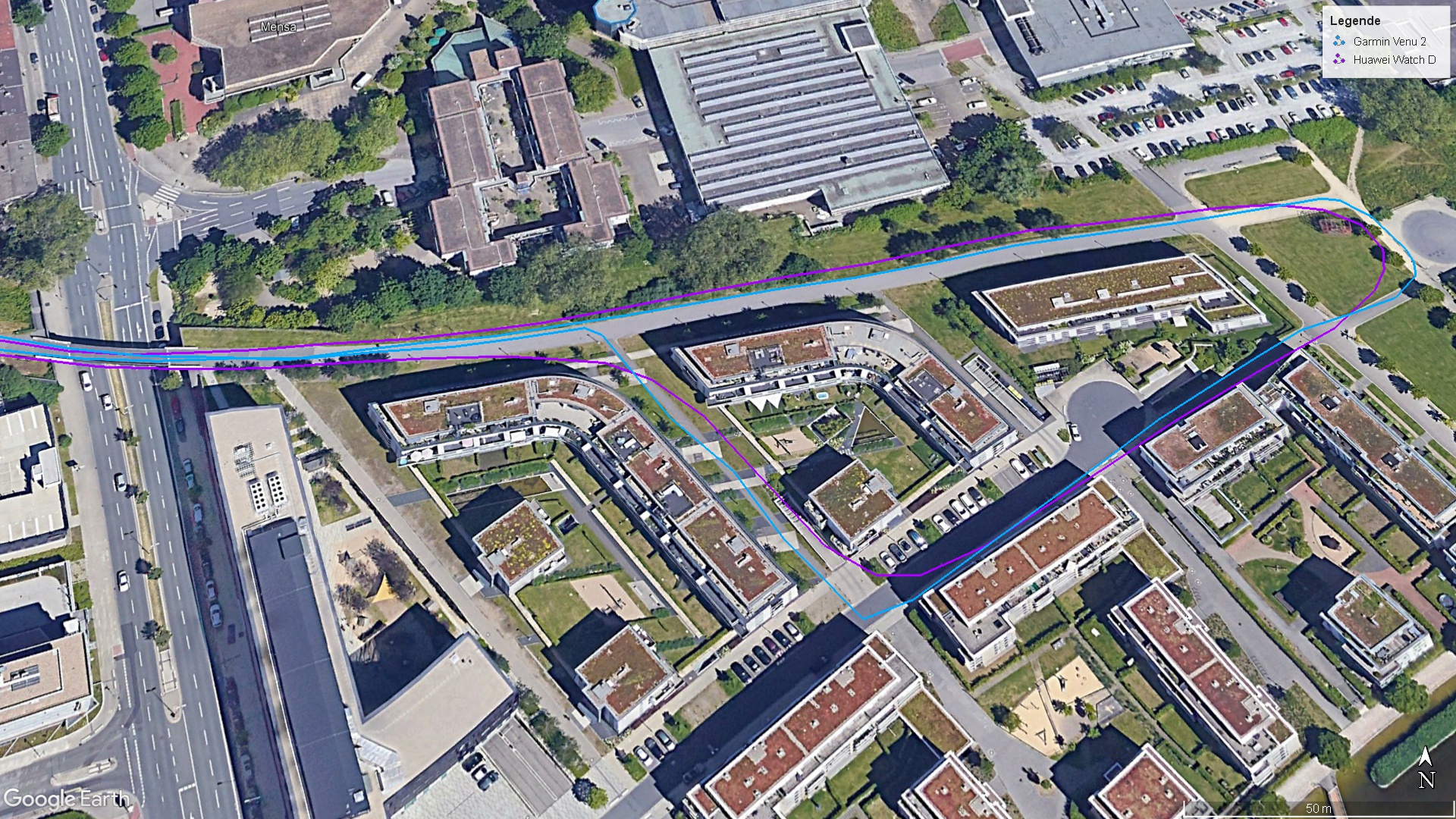 En una vuelta en bicicleta junto con el Garmin Venu 2, se hace evidente que el Huawei Watch se desvía del camino con más frecuencia en comparación. Los radios de las curvas no se muestran correctamente. Sin embargo, la distancia total registrada es muy similar, mientras que la medición de la altitud se desvía significativamente.