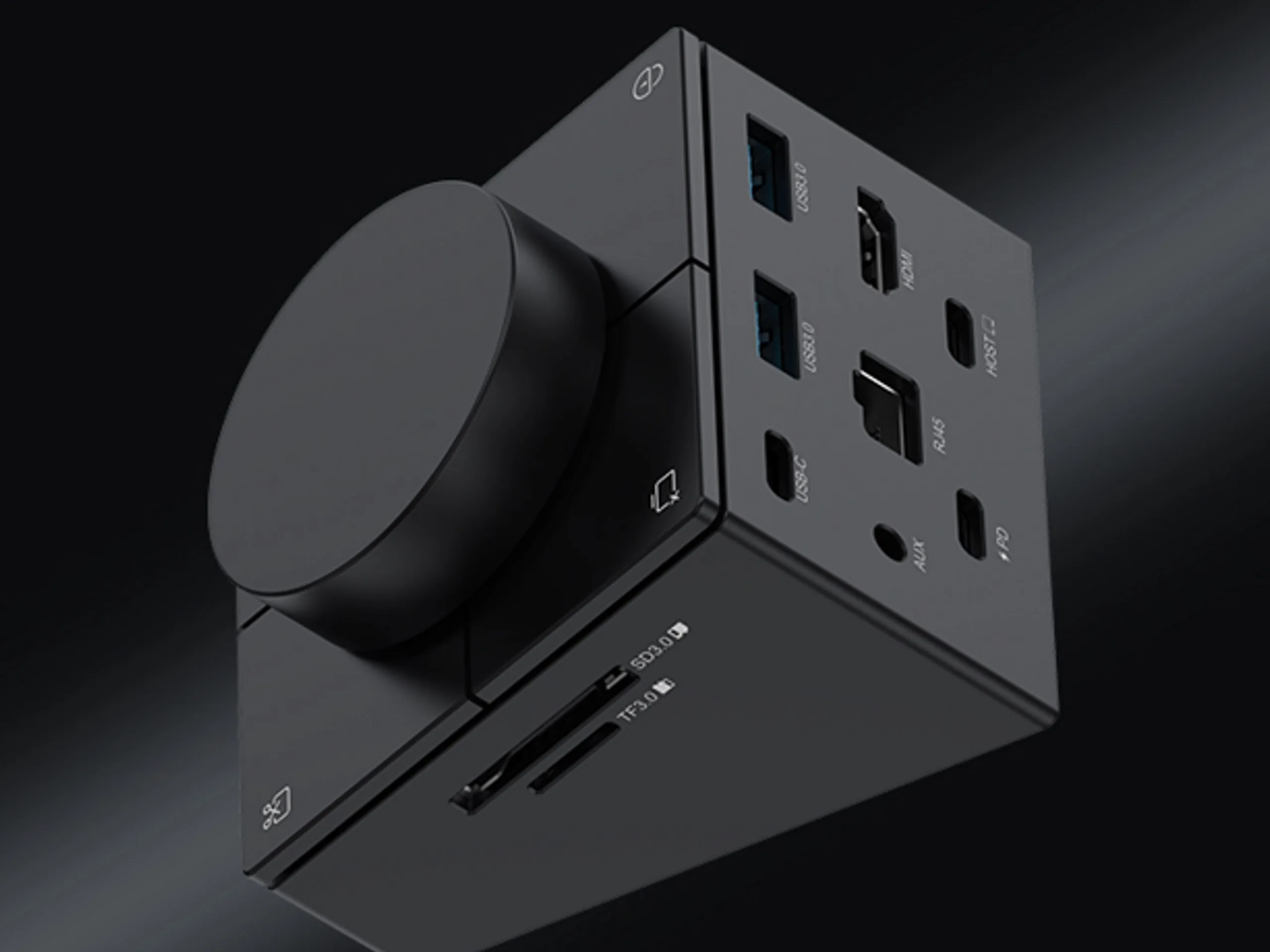 El dispositivo de acoplamiento/entrada de 7 x 7 x 3 centímetros pesa 250 gramos y dispone de diversos puertos. Puede conectarse a portátiles, MacBooks, smartphones, una Steam Deck o un mini PC compatible a través de USB-C. admite carga de 100 vatios a través de USB-PD, lo que permite una conexión a un dispositivo final con un solo cable. Se puede conectar un monitor a través de HDMI, que admite una frecuencia de actualización de 60 Hz y resolución 4K. También hay a bordo dos puertos USB 3.0 tipo A. Dispone de Gigabit Ethernet para la conectividad de red. En el lateral hay una ranura para tarjetas microSD y SD.
