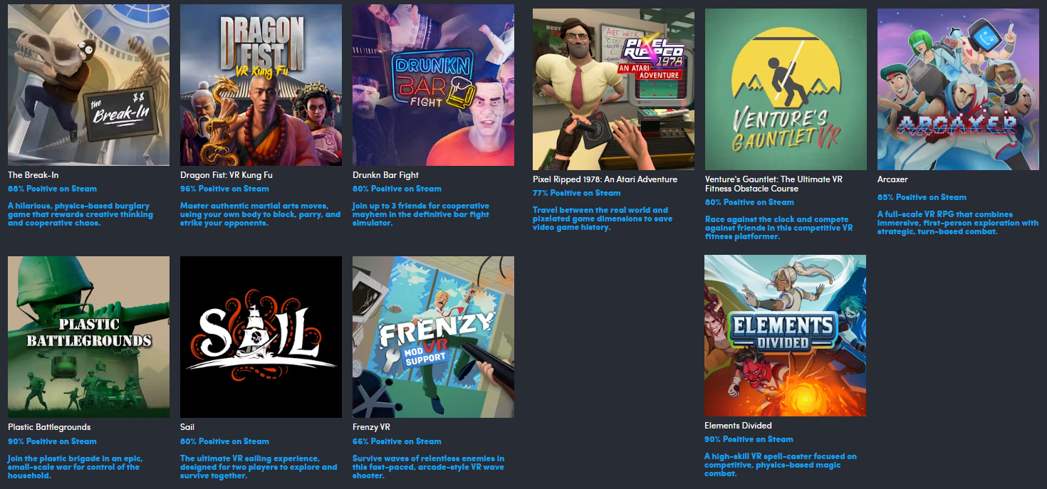 - The Break-In - jugable tanto en modo RV como en modo estándar, es un juego para cuatro jugadores juego cooperativo que trata de divertidas carreras de robos. Lanzado en 2025, vale 19,99 $ y actualmente cuenta con una valoración de los jugadores "Muy positiva".
