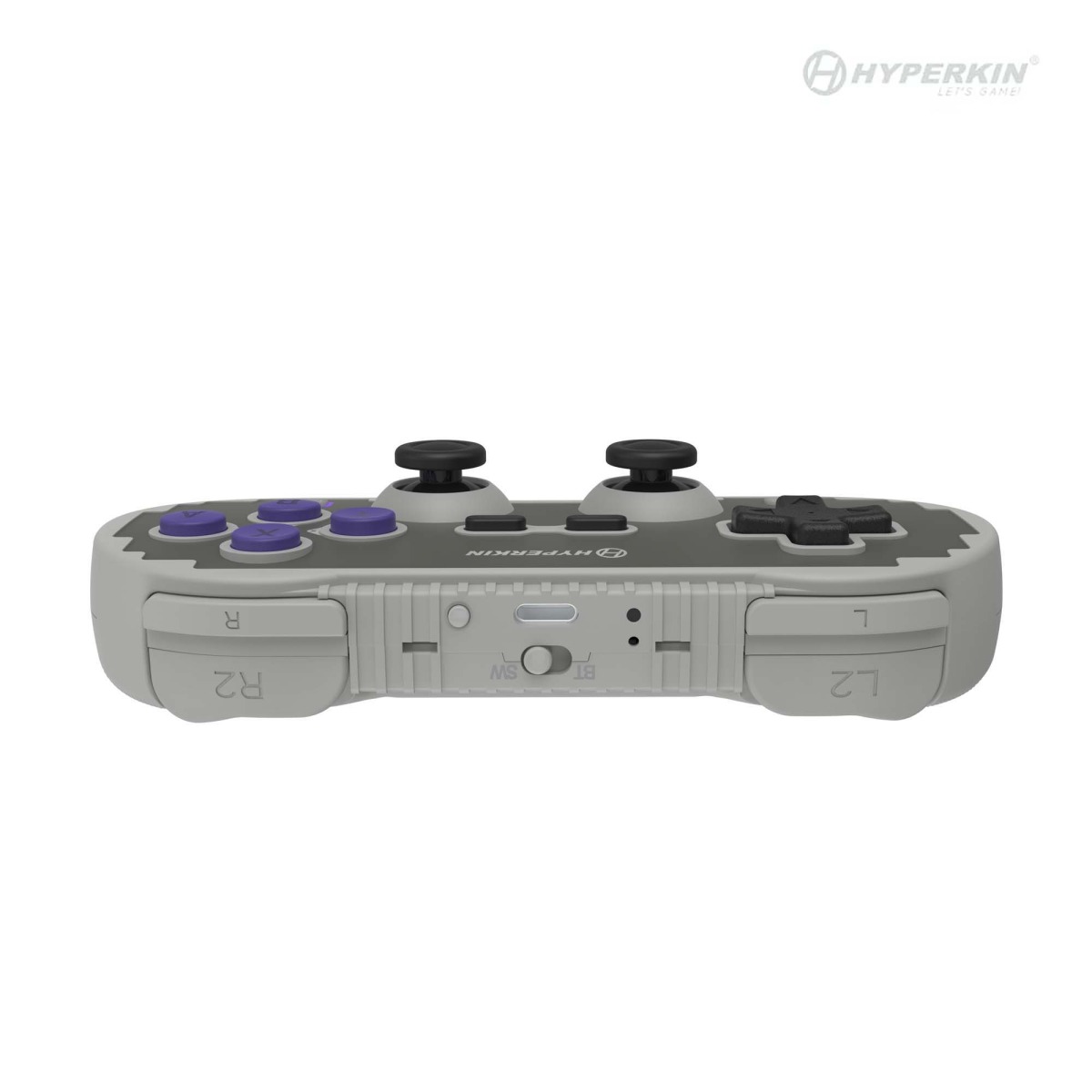 Hyperkin afirma que el mando cuenta con thumbsticks de efecto Hall, soporte giroscópico y función turbo. Se conecta a través de Bluetooth, pero también admite una conexión por cable mediante un cable USB Tipo-C. Su batería integrada proporcionará más de 15 horas de juego, que es un poco menos de las 18 horas que 8BitDo dice que el SN30 Pro es capaz de ofrecer.