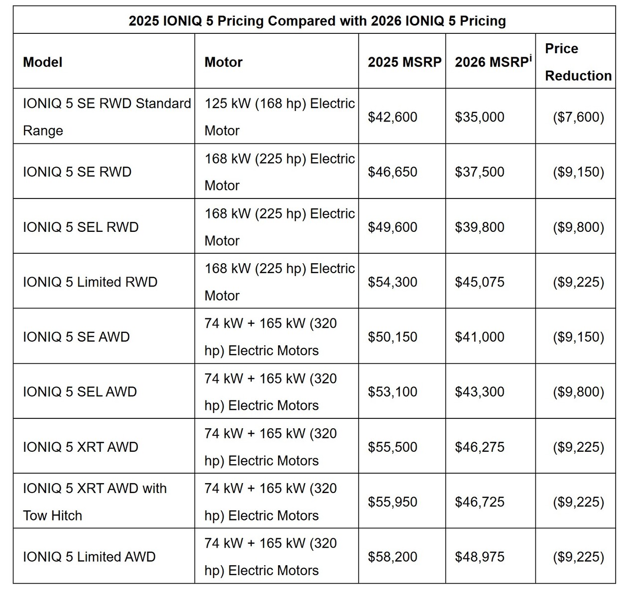 El 2026 Ioniq 5 SUV con puerto NACS de Tesla que no necesita un adaptador Lectron para recargar en los Supercargadores, por ejemplo, obtiene un recorte masivo de precio de hasta 9.800 $, para una etiqueta de salida de sólo 35.000 $ para el modelo base RWD.