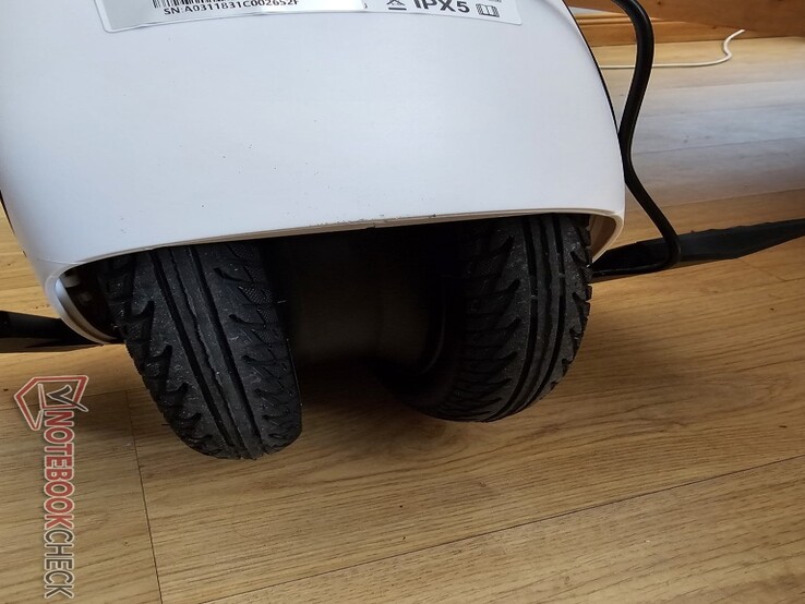 Por otra parte, las ruedas dobles no parecen ayudar al vehículo en terrenos que no sean suelos interiores u hormigón, para ser sinceros: parece completamente inadecuado para la grava o la hierba, entre otras cosas porque los neumáticos de 14 pulgadas son inflables y propensos a engancharse en las cosas.