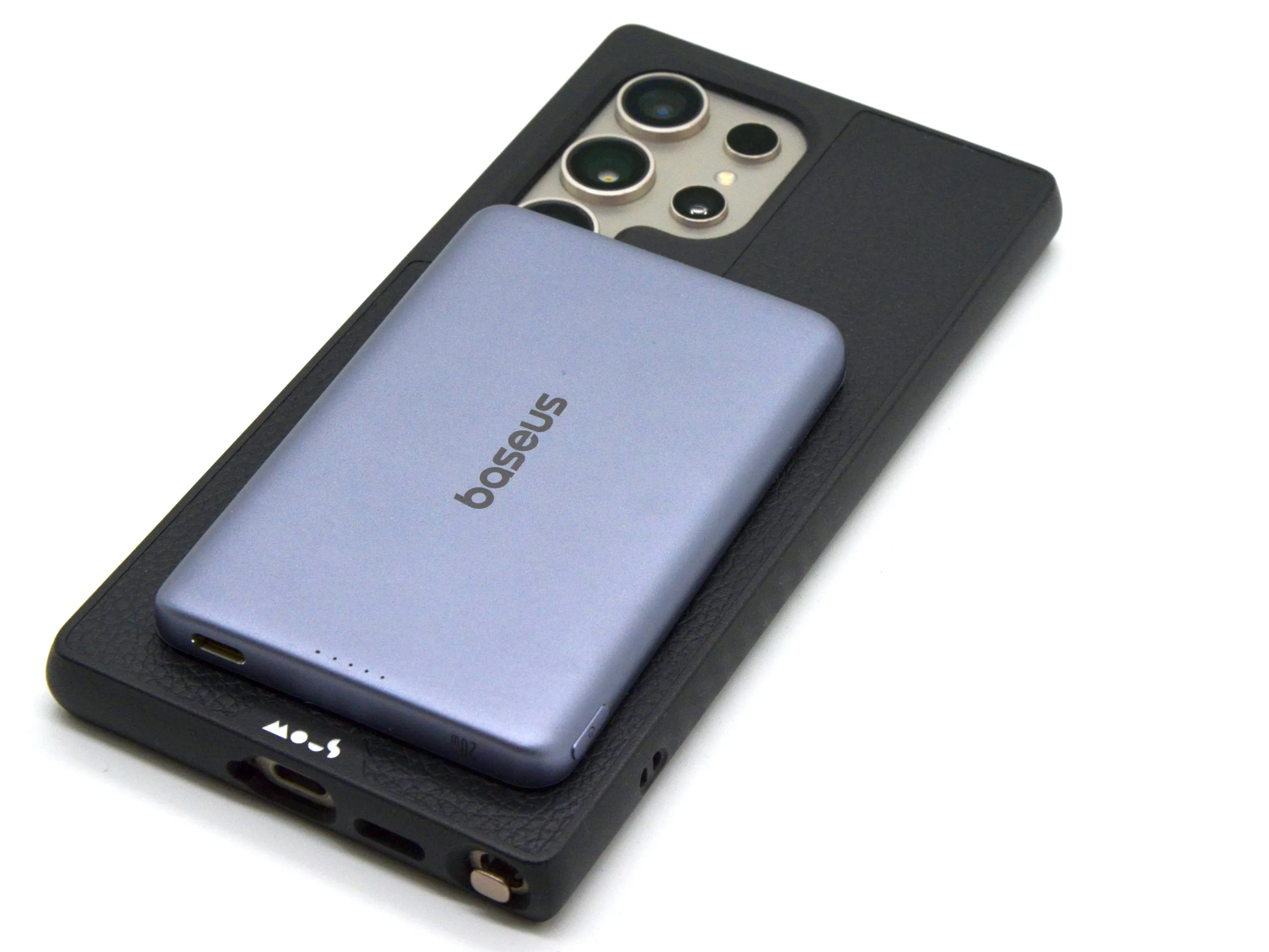 Cargamos una serie de dispositivos con el Baseus PicoGo AM52. El banco de energía admite Qi2.2, pero también carga de forma inalámbrica dispositivos que sólo admiten Qi2, como el Samsung Galaxy S24 Ultra. Con una funda adecuada, el PicoGo AM52 también se sujeta de forma segura a dispositivos que no admiten MagSafe o PixelSnap nada más sacarlo de la caja.