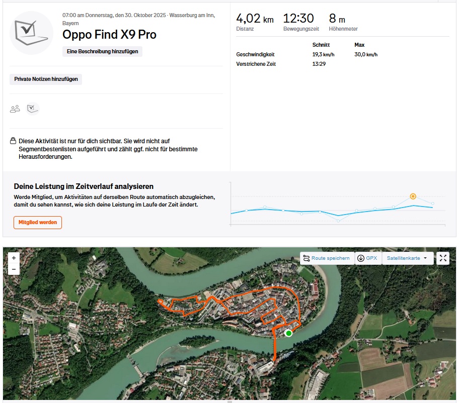 Para comprobar la precisión del posicionamiento en la vida cotidiana, llevamos el Find X9 Pro a un corto paseo en bicicleta y comparamos los valores medidos con un Garmin Venu 2 como referencia. En el mejor de los casos, la posición del teléfono Oppo se determina utilizando GNSS de doble banda y un Satfix rápido, incluso dentro de edificios.