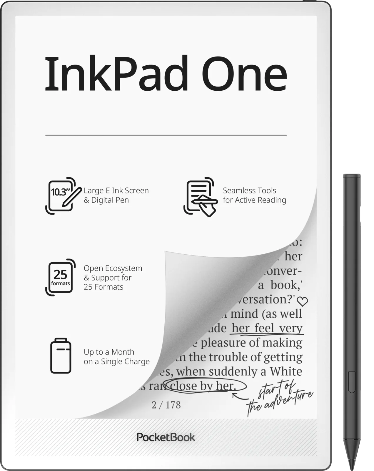 Además de para visualizar contenidos, el lector electrónico también puede utilizarse para tomar notas. El InkPad One cuenta con una función para tomar notas que permite añadir comentarios y marcas utilizando el Stylus 2 incluido. Este dispositivo de 5,15 mm de grosor también ofrece reproducción de archivos de audio, como audiolibros y otros archivos, a través de Bluetooth, así como una función de texto a voz para leer archivos de texto en voz alta