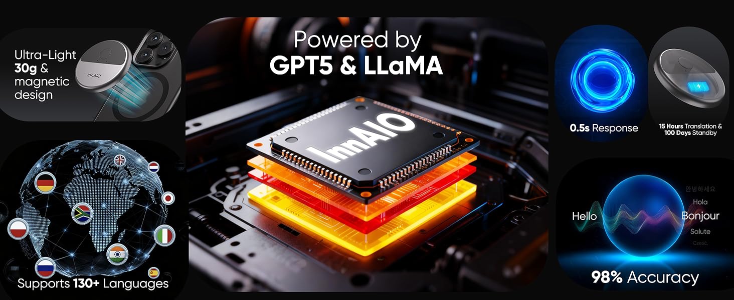 Según la empresa, el traductor funciona con GPT-5 y el modelo lingüístico de InnAIO, y es compatible con más de 130 idiomas. Los usuarios también pueden cambiar entre dialectos, e InnAIO afirma que el dispositivo ofrece una velocidad de traducción de 0,5 segundos y presume de una precisión del 98%.