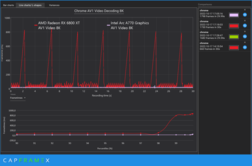 Con el fin de poner a prueba la capacidad de la A770 para descodificar vídeos AV1 en resoluciones 4K y 8K, el desarrollador de la herramienta de análisis CapFrameX ha enfrentado a la mejor GPU de Intel con la Nvidia RTX 3090 y RTX 4090 de Nvidia y la Radeon RX 6800 X de AMD Radeon RX 6800 XT de AMD. Los recuentos de media, 1% y 0,2% de fps proporcionados por CapFrameX se obtuvieron realizando la decodificación 4K y 8K en el vídeo "Japón en 8K 60 FPS" subido a YouTube.