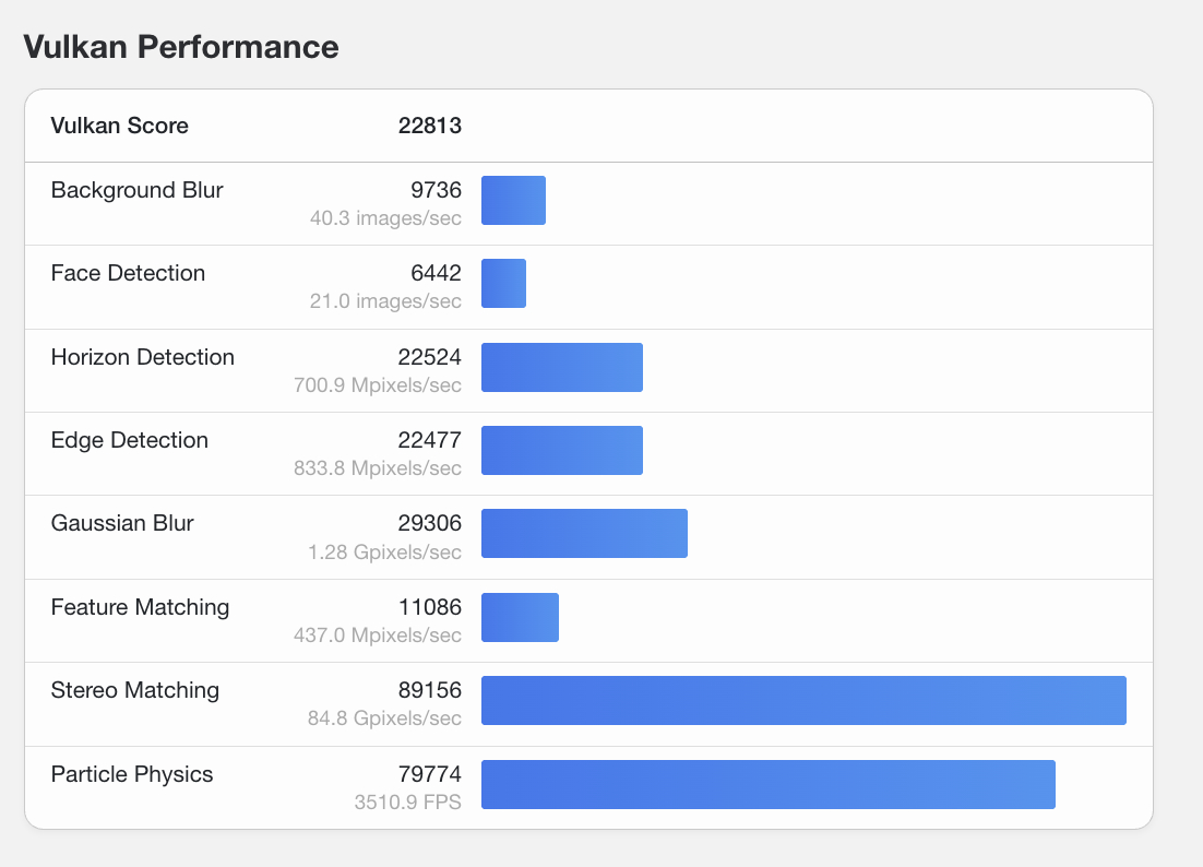 Por desgracia, Geekbench no identifica cuántos núcleos Arc Xe3 posee esta iGPU. No obstante, su puntuación de 22.813 en Geekbench 6.5.0 Vulkan la sitúa a la par de la Radeon 840M y sus 4 unidades de cálculo (CU). Potencialmente, podría tratarse de la misma iGPU que se encuentra en los Core Ultra 5 336H y Core Ultra 5 338H en lugar de equivalentes de 10 núcleos como el Arc B360 o Arc B370.