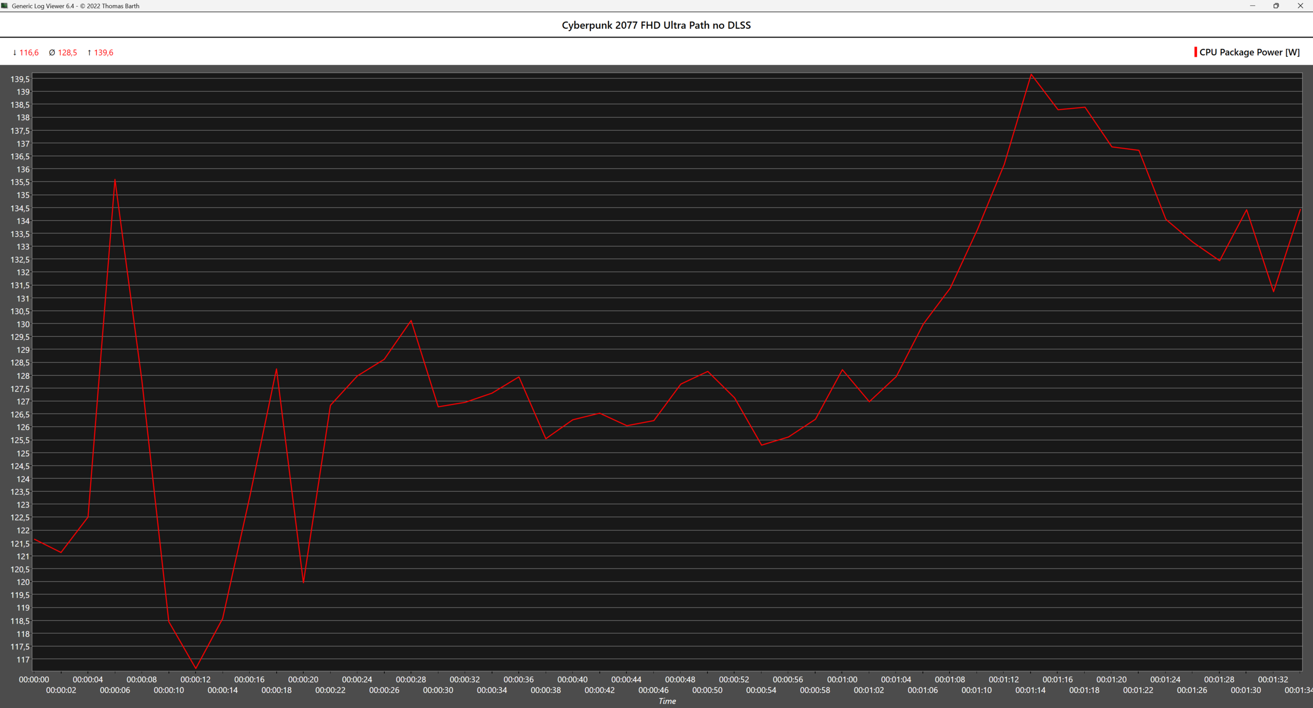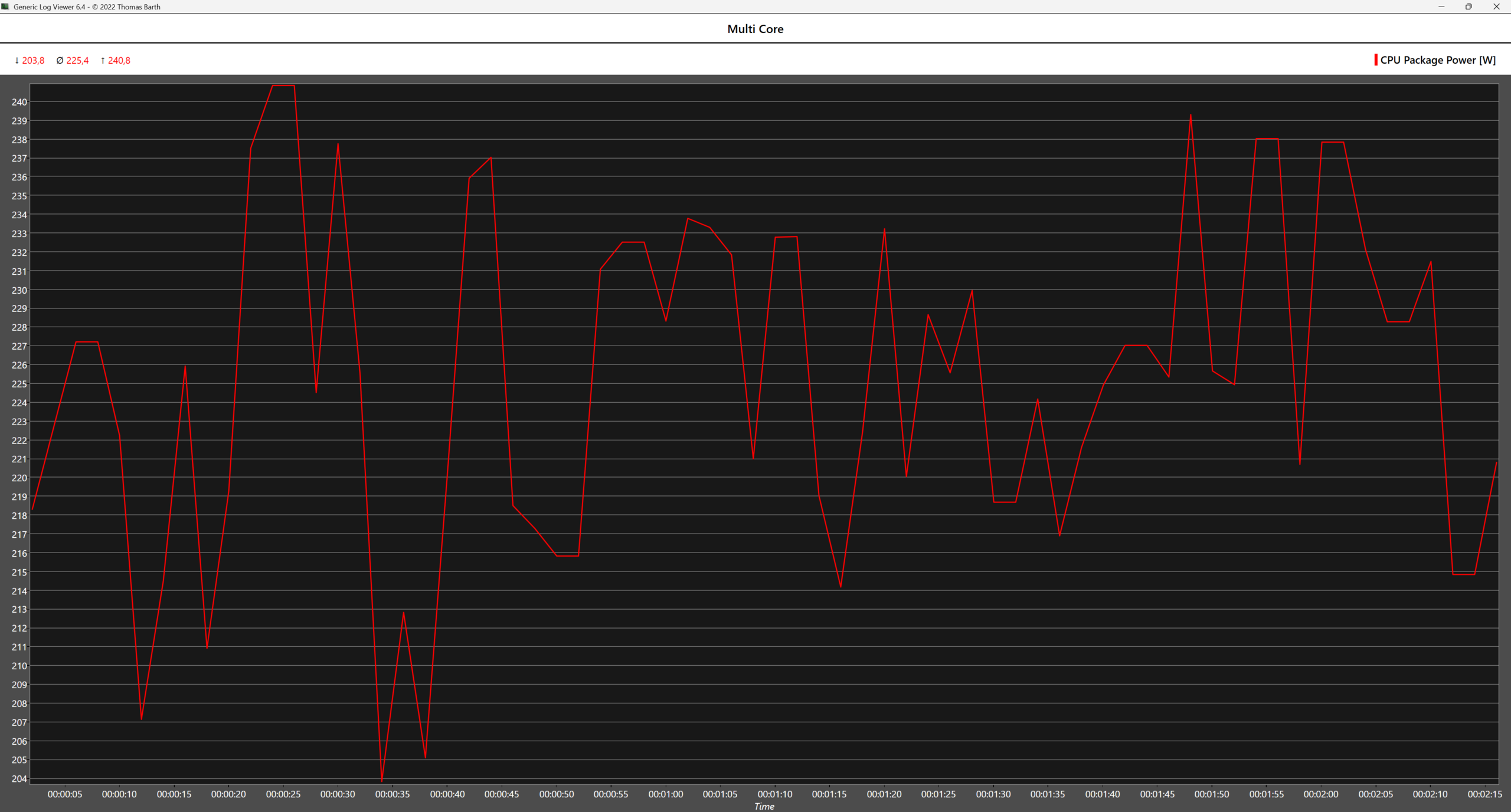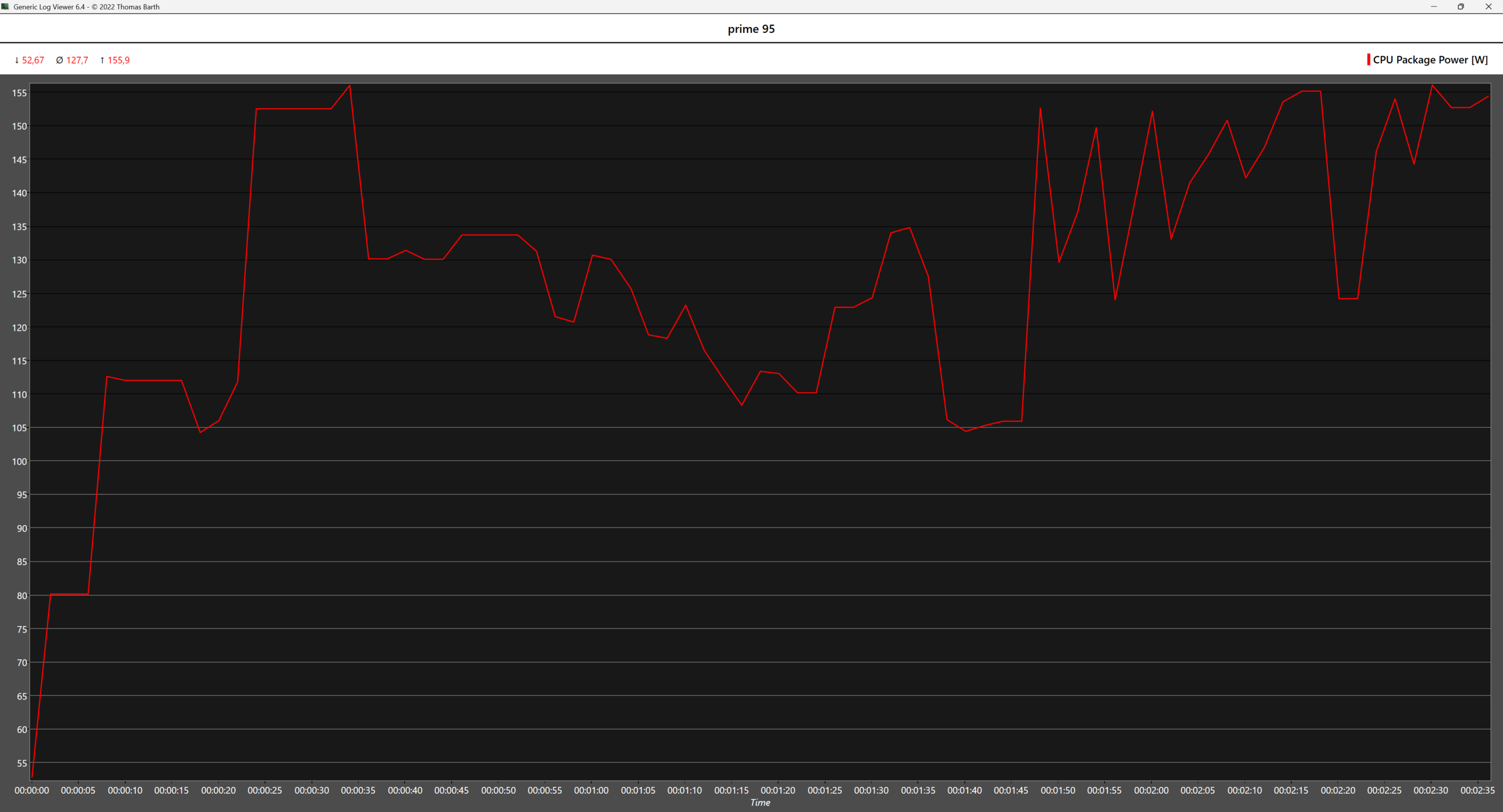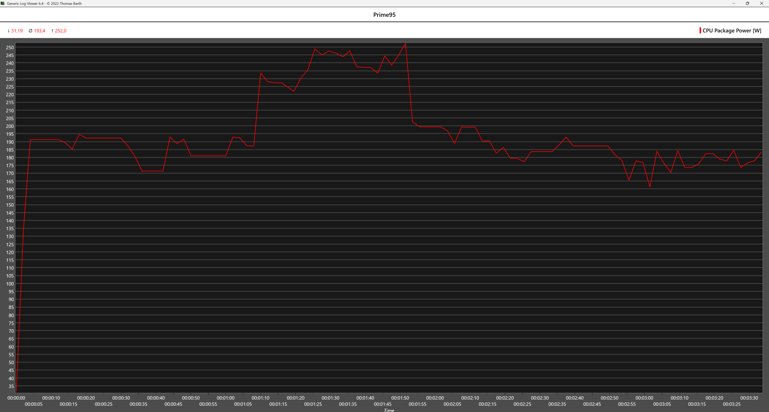 En escenarios en los que se utilizan todos los núcleos, como la prueba de estrés multinúcleo de Cinebench 2024 o la prueba de gran FTT de Prime 95, la CPU AMD resulta menos hambrienta de energía incluso con el perfil de potencia Alto rendimiento. En Prime 95, la CPU AMD consume 65 W menos de media en comparación con la Intel, mientras que la CPU Intel también entra en estado de estrangulamiento térmico y casi alcanza el TJMAX en el primer minuto de la prueba, con las temperaturas bajando gradualmente después. Sin embargo, no es muy probable que estos casos extremos se den en escenarios del mundo real.