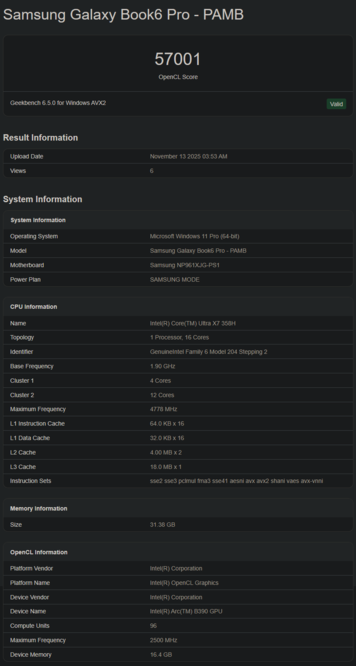 El portátil en cuestión es el próximo Samsung Galaxy Book6 Pro. Una variante alternativa con un Core Ultra 5 338H se filtró anteriormente con una iGPU Arc B570. Dispone de 32 GB de RAM, con 16 GB asignados a la iGPU en este caso. Se espera que se lance el próximo año junto con el más potente Galaxy Book6 Ultra.