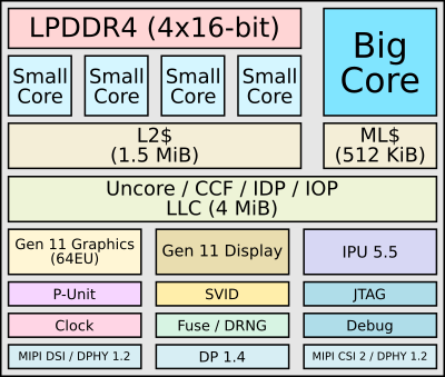 Con un TDP especificado de 7 vatios (PL1, 9,5 vatios PL2), la CPU es muy adecuada para portátiles delgados y ligeros y tabletas basadas en Windows. / 2 en 1. Intel afirma que la potencia de reserva se redujo en gran medida (91% mejor en comparación con el i7-8500Y con 2,5 mW). El SoC se fabrica en 10nm y utiliza la tecnología de embalaje 3D de Intel Foveros. Foveros se utiliza para apilar el dado de E/S fabricado en 22FFL, el dado de computación en 10nm y hasta 8 GB LPDDR4X-4267.