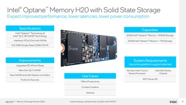El H20 sigue utilizando la conectividad PCIe Gen3 NVMe y requiere un procesador de 11ª generación de la serie U Tiger Lake junto con un chipset Intel de la serie 500 y el controlador 18.1 de la tecnología de almacenamiento rápido (RST). Esto significa que Optane H20 estará restringido a los portátiles OEM Tiger Lake (a partir del segundo trimestre de 2021) y es poco probable que esté disponible para otras plataformas.