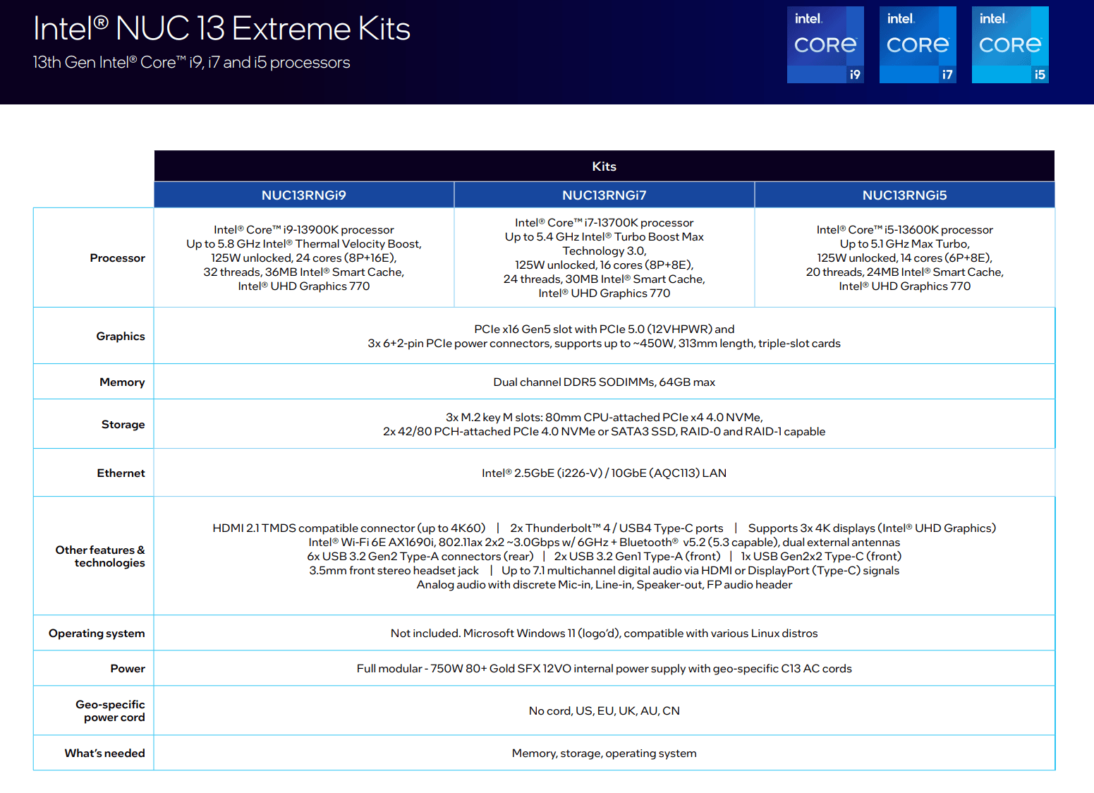 Los kits NUC 13 Extreme vienen con una fuente de alimentación SFX de 750 W y estarán disponibles primero en China, mientras que se espera una mayor disponibilidad a finales del cuarto trimestre y principios del primer trimestre de 2023. Los precios de los kits oscilan entre 1179 y 1549 dólares, e Intel también ofrece actualizaciones para el elemento de computación que oscilan entre 760 y 1100 dólares, dependiendo de las configuraciones de memoria, almacenamiento y sistema operativo.