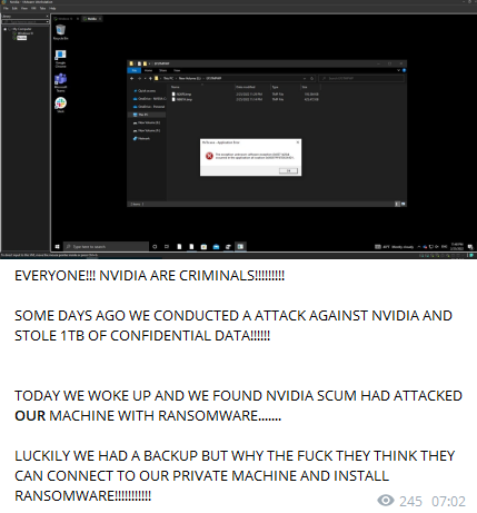 Sin embargo, parece que el grupo de ransomware ha sido atacado de nuevo por Nvidia, y los hackers tomaron para ventilar sus quejas públicamente. El grupo publicó mensajes en su cuenta de Telegram, compartidos posteriormente por un analista de amenazas de https://twitter.com/BrettCallow/status/1497627779755438083 en Twitter, en los que se ironiza sobre Nvidia como "criminales" y "escoria" por intentar instalar un "ransomware" en las máquinas del grupo. Lapsus$ además afirma que ya había hecho una copia de seguridad de los datos robados en otro lugar, lo que convierte el intento de cifrado de Nvidia en un ejercicio poco gratificante.