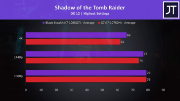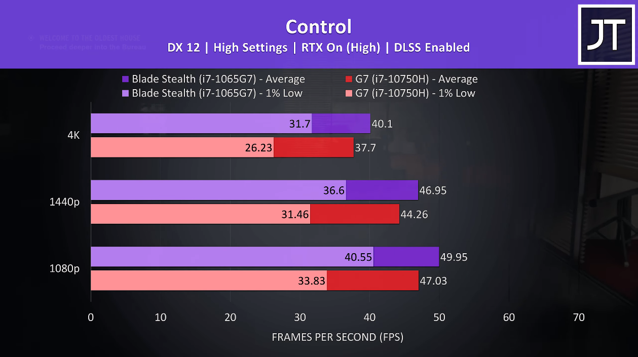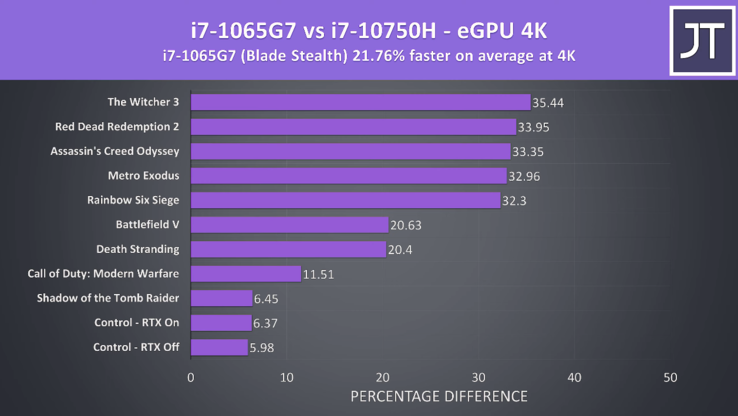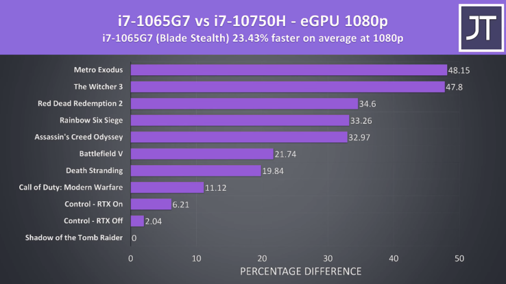 Este diseño diferente del controlador Thunderbolt 3 permite que el Corei7-1065G7 tenga un promedio de más del 20% de cuadros más altos que el Core i7-10750Ha 1080p, aunque esto varía entre el 2% y el 48% dependiendo del juego. Apenas hay diferencias entre las dos fichas de Control, pero el Corei7-1065G7 domina al Core i7-10750Hen títulos como