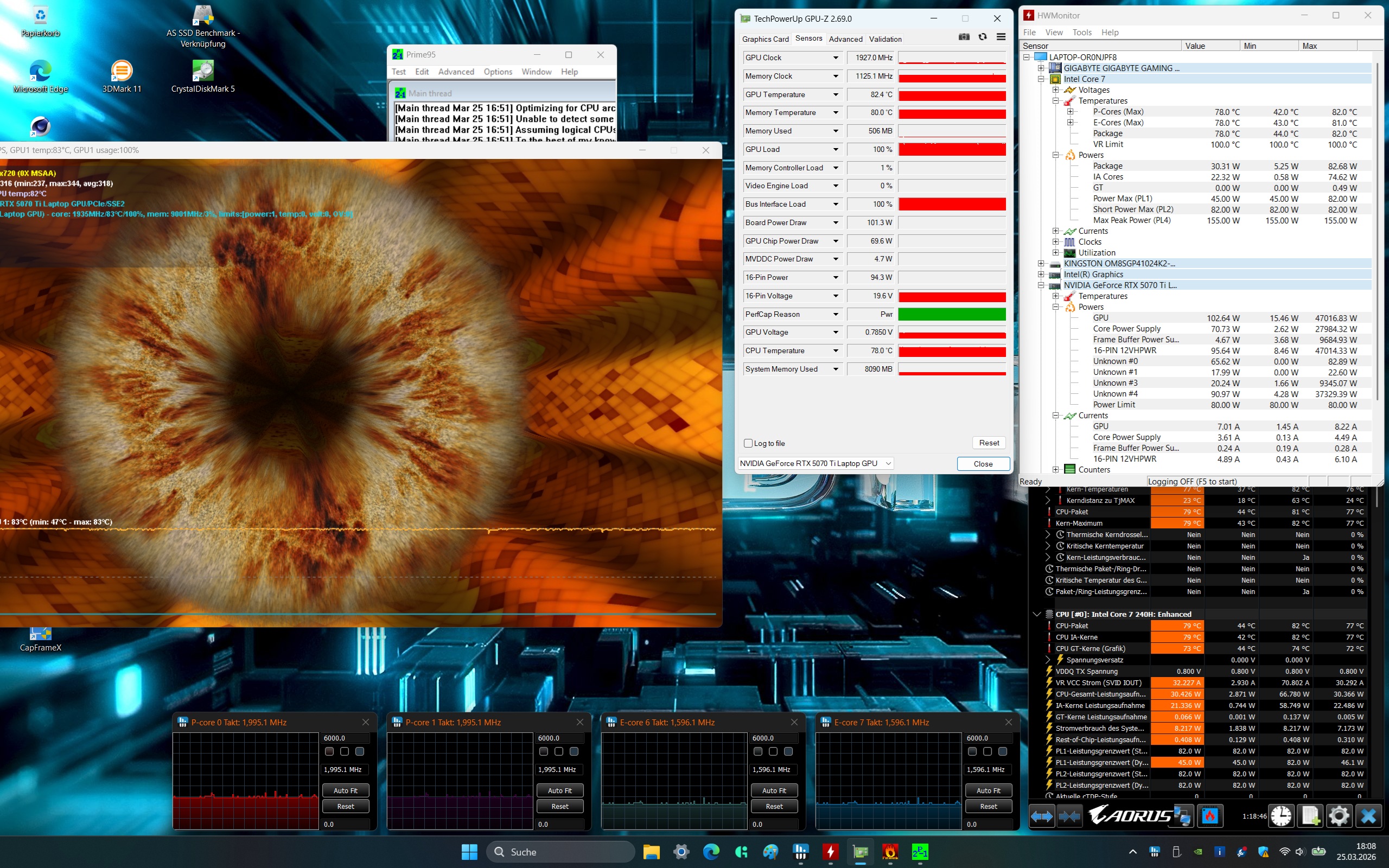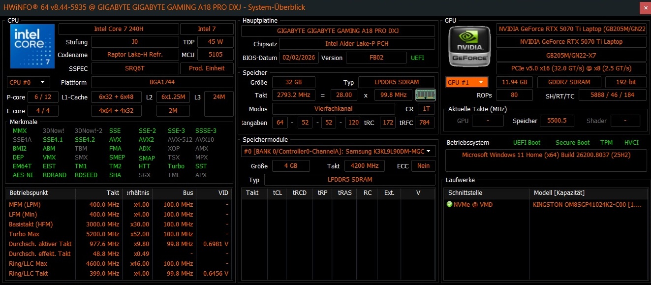 | Gigabyte Gaming A18 Pro Intel Core 7 240H ⎘ NVIDIA GeForce RTX 5070 Ti Laptop ⎘ 32 GB Memoría, 1024 GB SSD | Precio de catálogo: 2399 EUR | 2.9 kg | 25 mm | 18.00" 2560x1600 168 PPI IPS | |
