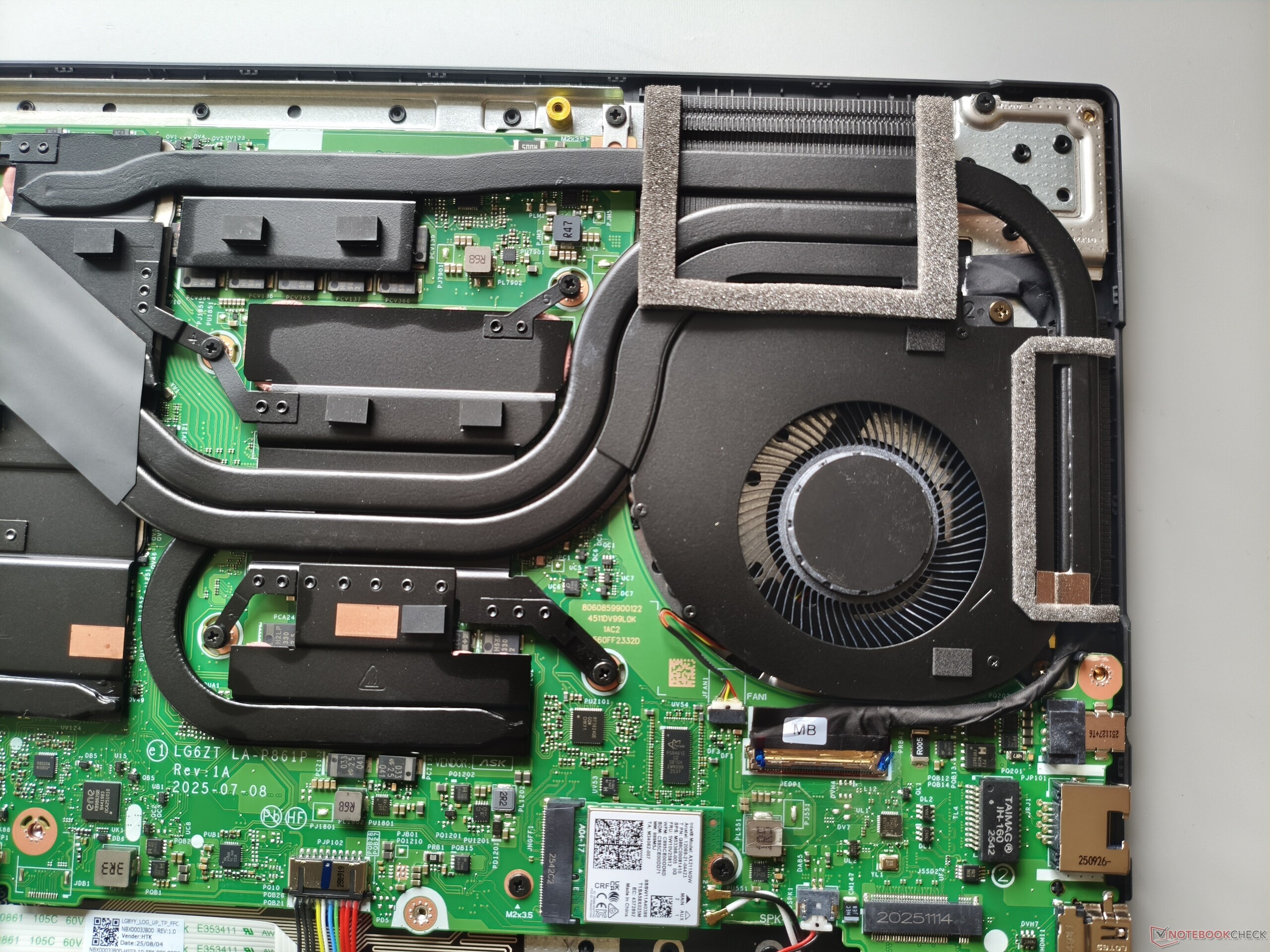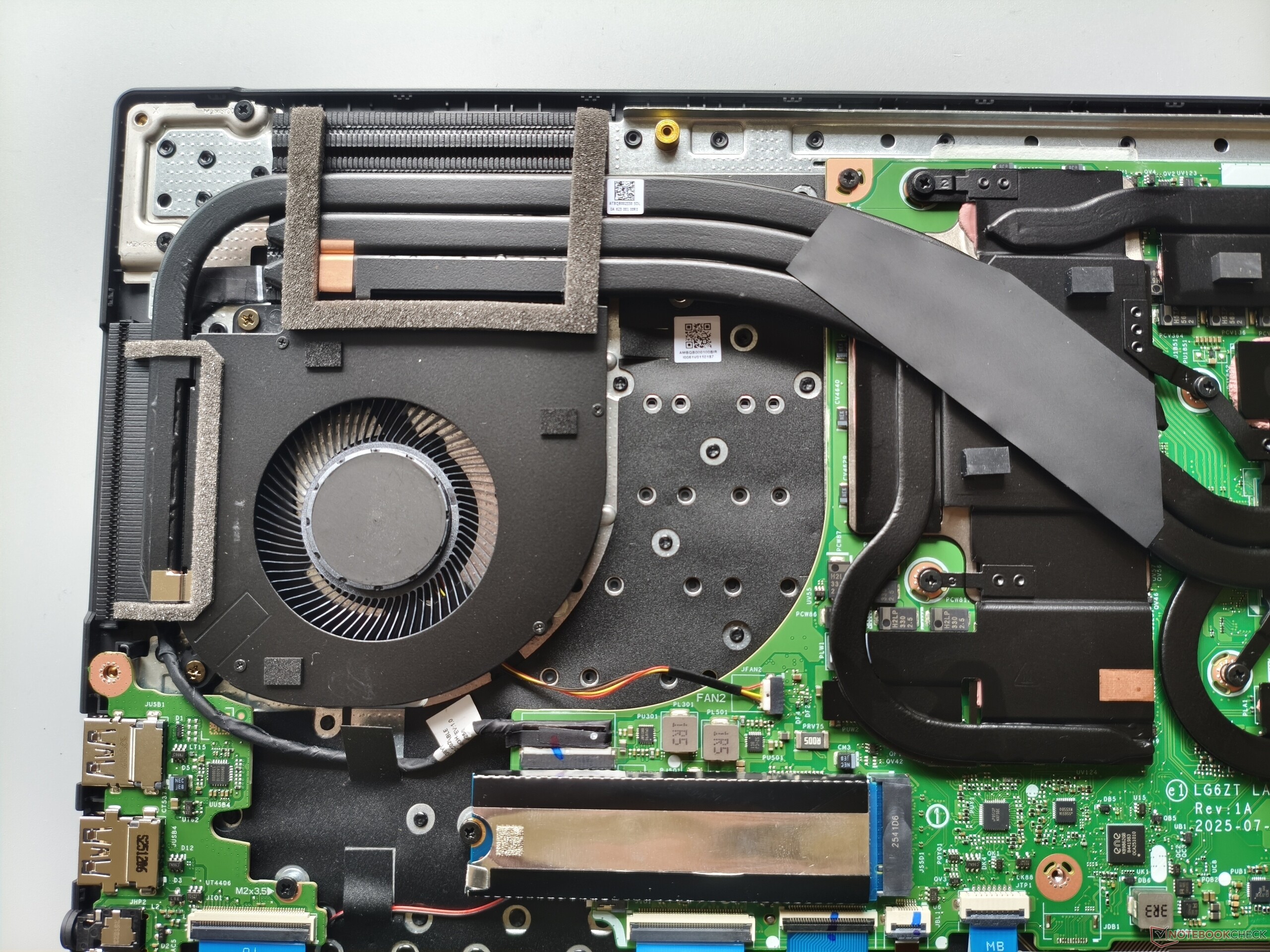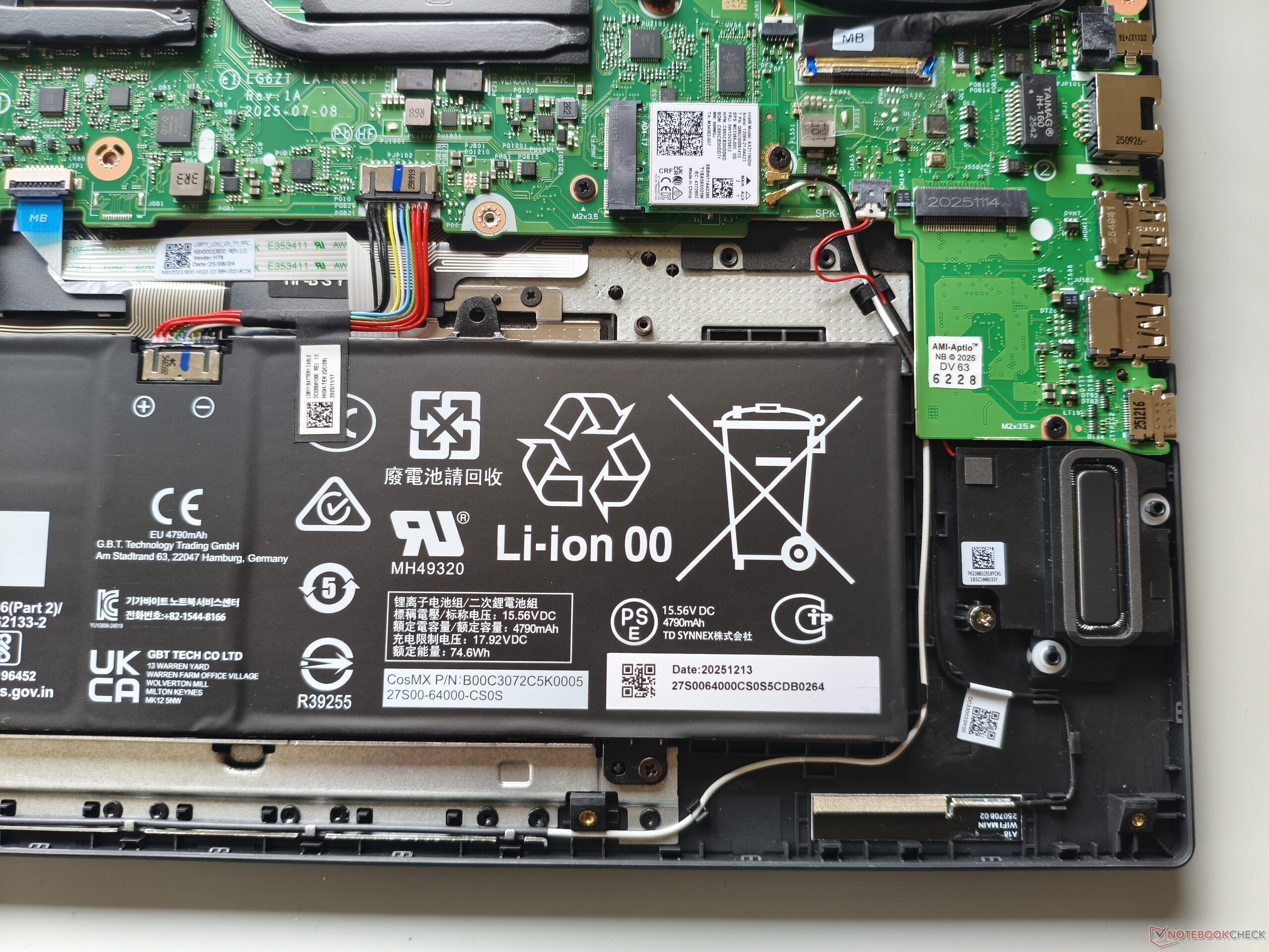 El panel inferior puede retirarse tras aflojar 11 tornillos Phillips. Debajo, queda claro que habría habido espacio para una batería más grande. Las dos ranuras M.2 para SSD (una de las cuales sigue libre) son bastante decentes, pero la RAM soldada y la falta de ranuras SO-DIMM son un inconveniente desde el punto de vista de las actualizaciones.