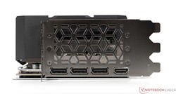 La tarjeta gráfica se alimenta a través de un conector 12VHPWR. Puede haber división de opiniones sobre este conector, pero aún no hemos encontrado ningún problema con él. El único problema es que creemos que el conector 12VHPWR está colocado en un lugar poco óptimo. Debido a lo mucho que sobresale la tarjeta gráfica por encima de la ranura PCIe, hay que asignar suficiente espacio al gran cable adaptador para que no se enrosque justo al lado de la GPU. Esto podría causar problemas de espacio en muchas cajas de ordenador