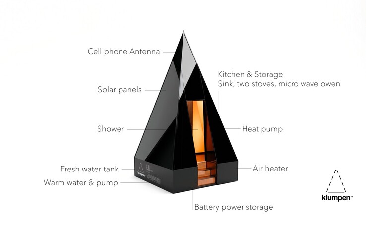 La estructura en forma de tienda tiene una longitud de borde de 2 metros y una altura de 4,85 metros. Las paredes están equipadas con paneles fotovoltaicos. Esta energía se almacena en tres baterías con una capacidad total de 7,5 kWh. Por último, la batería hace funcionar las demás funciones de Klumpen, incluido un módem de teléfono móvil y una conexión de banda ancha por satélite, de modo que también debería ser posible una conexión rápida a Internet en lugares remotos.