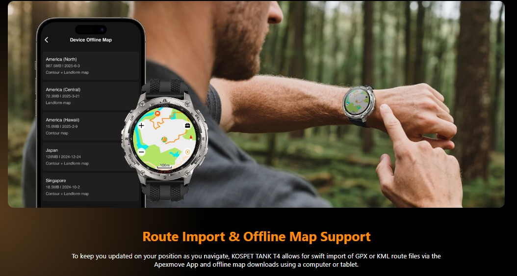 Como es habitual, lleva instalados sensores ópticos que no sólo sirven para medir la frecuencia cardiaca, sino también la saturación de oxígeno. No se admiten ECG, pero sí la monitorización del sueño. Además, el Kospet Tank M4 viene con un altavoz y un micrófono, lo que permite utilizarlo como dispositivo manos libres Bluetooth, y también tiene una función de walkie-talkie con un alcance limitado de 40 metros. La duración de la batería se especifica en hasta 15 días en uso típico o hasta 22 horas en modo GPS. Por último, se dice que el reloj es resistente al agua hasta una presión de prueba de 10 ATM