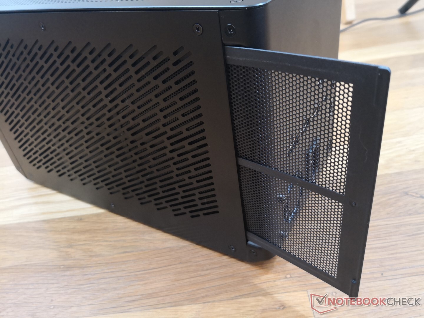 La mayoría de los puertos se encuentran en la parte trasera y sólo hay un puerto USB-A en la parte delantera. No hay botón de encendido, por lo que la eGPU siempre está "encendida" aunque el PC principal esté apagado. El consumo de energía es preocupantemente alto como se detalla en nuestra sección de consumo de energía a continuación.