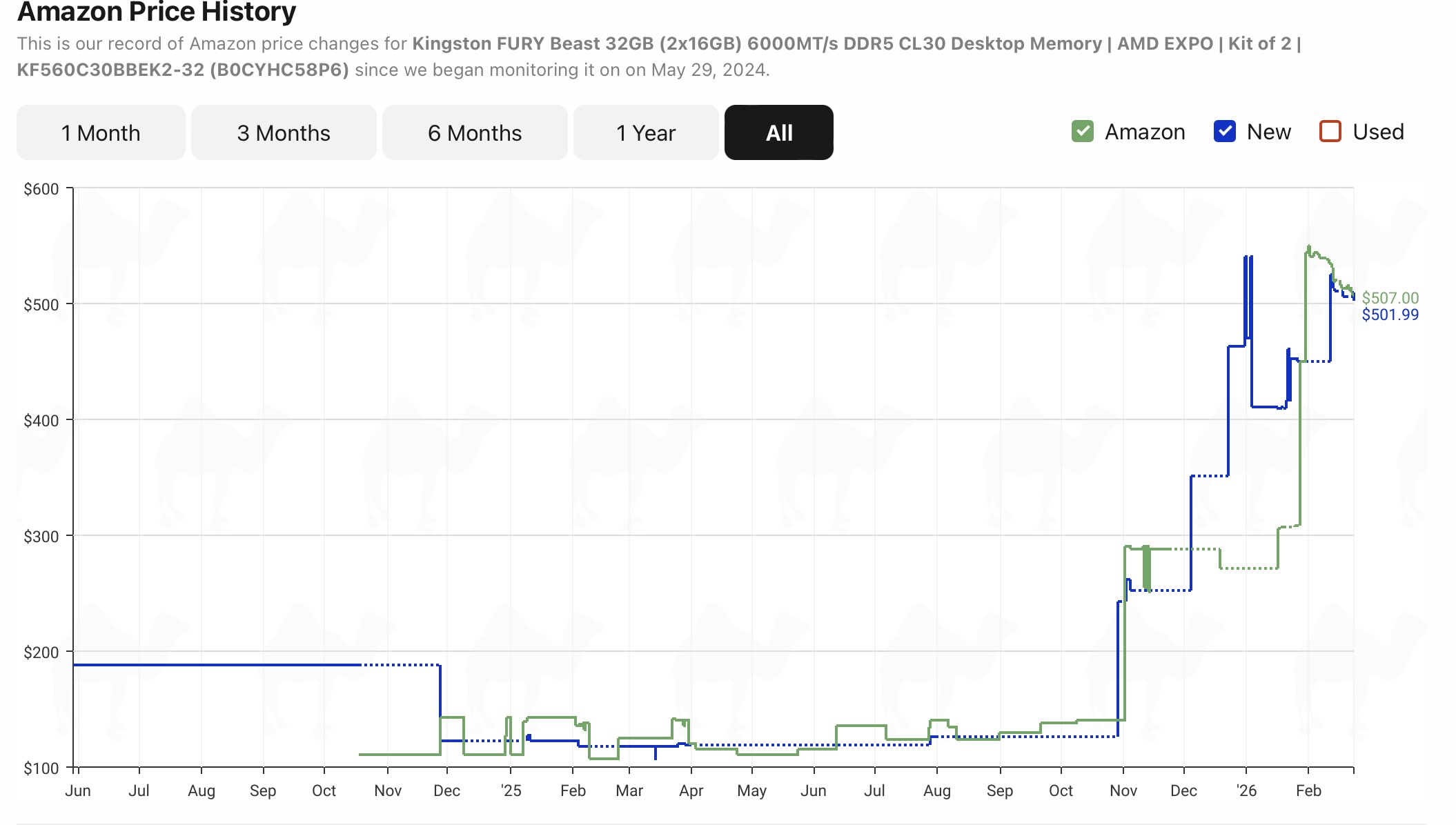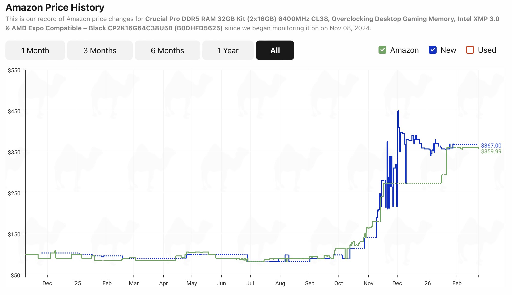 Dada la situación actual del mercado, incluso una ligera bajada podría bastar para que los jugadores dejaran escapar un suspiro de alivio. En Estados Unidos, por ejemplo, un kit de 32 GB DDR5-6400 de Crucial cuesta ahora mismo unos 360 dólares en Amazon. Curiosamente, en comparación con los máximos históricos de diciembre de 2025, los precios parecen haberse estabilizado bastante también en EE UU.