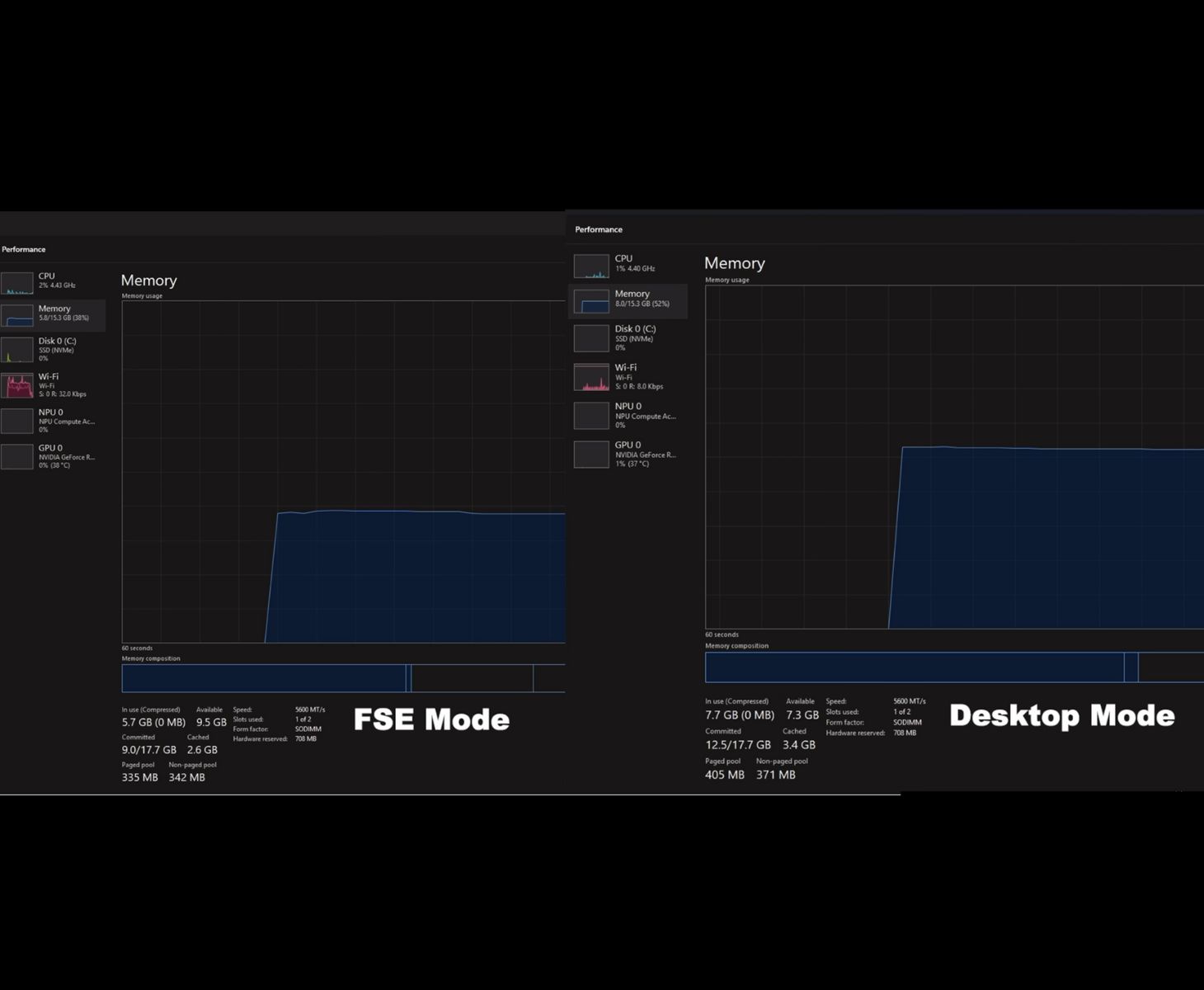 Un aspecto notable de FSE es su capacidad para suspender el entorno de escritorio estándar de Windows, lo que reduce los procesos en segundo plano y disminuye el uso general de memoria. En las pruebas mostradas por el YouTuber, un portátil para juegos equipado con una Nvidia GeForce RTX 5050 utilizó alrededor de 5,7 GB de RAM en FSE en comparación con 7,7 GB en el modo de escritorio normal, alineándose con La afirmación de Microsoft de unos 2 GB ahorrados. Esta reducción puede beneficiar significativamente a los sistemas con memoria limitada o configuraciones de gráficos integrados que dependen de la RAM compartida.