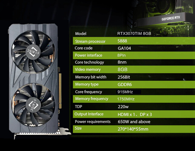 La de 51Risc, denominada RTX 3070 TiM, es una tarjeta PCIe de doble ranura con 5.888 núcleos CUDA, 8 GB de VRAM GDDR6 a 17,5 Gbps, un boost de 1.410 MHz y un TDP más conservador de 220 W. Hay un único conector de 8 pines a bordo.