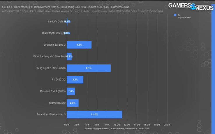 Según las pruebas realizadas por GN en 4K, la RTX 5080 con todas las ROP muestra desde ninguna ventaja de rendimiento hasta una mejora del 11%. La delta más pequeña se da en juegos como Baldur's Gate 3 y Mito Negro: Wukong donde no hay diferencia entre las dos tarjetas. Sin embargo, la RTX 5080 con 112 ROPs resulta ser un 4,9% más rápida que la RTX 5080 con ROPs faltantes en Dragon's Dogma 2. La diferencia aumenta al 8,7% en Dying Light 2 y a un mencionable 11% en Total War: Warhammer 3.