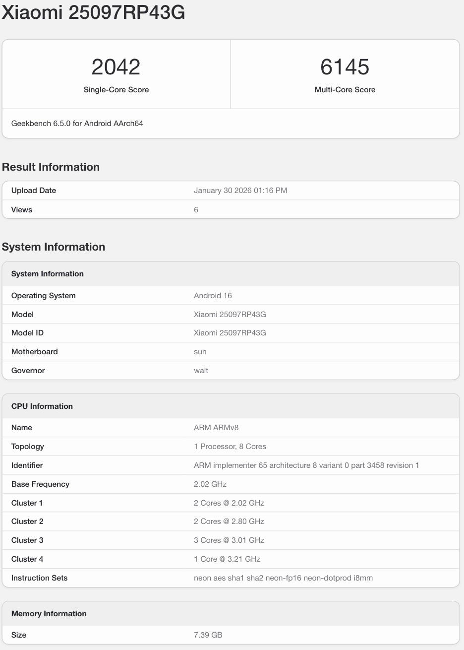 El listado global de la Xiaomi Pad 8 en Geekbench https://browser.geekbench.com/v6/cpu/16337435 revela el número de modelo "25097RP43G" Está alimentado por el Snapdragon 8s Gen 4 junto con 8 GB de RAM. La tableta obtiene una puntuación de 2.042 en las pruebas de un solo núcleo y de 6.145 en las de varios núcleos.
