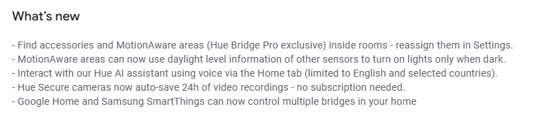 Otro cambio en la actualización de la versión 5.54 de la aplicación Philips Hue es para el Asistente Hue AI, que se encuentra en la pestaña Casa. El asistente ahora admite comandos de voz, aunque por ahora sólo para el idioma inglés. La empresa también indica que está disponible en una selección limitada de países, sin dar más detalles. Otro cambio es para la cámara Hue Secure, que ahora tendrá 24 horas de grabaciones de vídeo guardadas automáticamente de forma gratuita. Por último, hay soporte para múltiples configuraciones de puentes para ser controlados a través de Google Home y Samsung SmartThings.