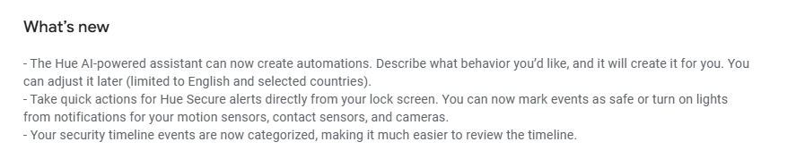 En la versión 5.55, Philips Hue añade nuevas mejoras para el Asistente Hue AI. Ahora puede utilizarlo para crear automatizaciones describiendo al robot el comportamiento deseado. El asistente generará la automatización pertinente, que el usuario podrá ajustar manualmente. Cabe señalar que el Asistente Hue AI sólo está disponible cuando el idioma de la aplicación está configurado en inglés, y aún no está disponible en todos los países.