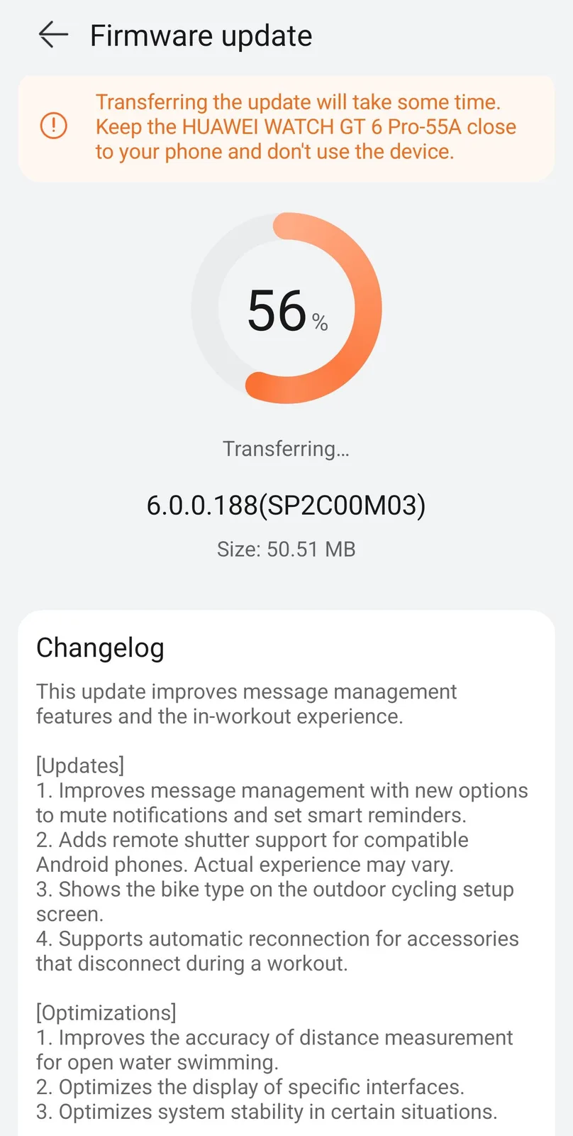 Las notas de la versión del Watch GT 6 y del Watch GT 6 Pro comparten muchas similitudes. Ambas mencionan la compatibilidad con una gestión de notificaciones mejorada, con la posibilidad de que los usuarios configuren notificaciones silenciosas y recordatorios inteligentes. Los usuarios de dispositivos Android pueden ahora controlar a distancia la cámara de su smartphone desde el reloj, y hay una optimización relacionada con Alipay. Además, se ha informado a https://www.ithome.com/0/921/495.htm en China que una versión mejorada de la aplicación WeChat, la 1.1.0, añade compatibilidad con los mensajes de voz a texto.