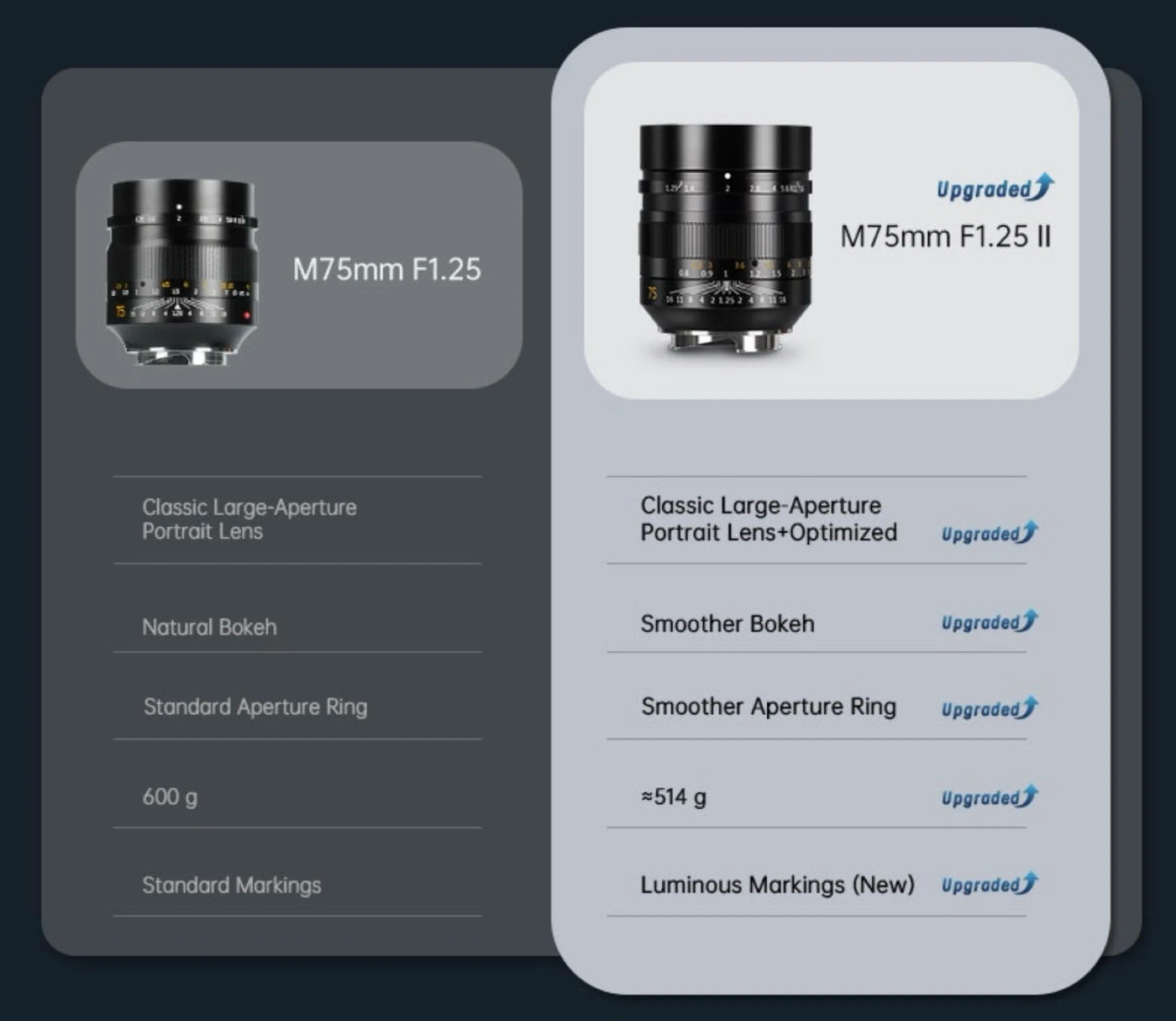 7Artisans relanza uno de sus objetivos para retratos más interesantes. El 75 mm f/1,25 II ha recibido un diseño modernizado, que difiere de su predecesor principalmente en las letras, ya que el color brilla con poca luz para mejorar la legibilidad.