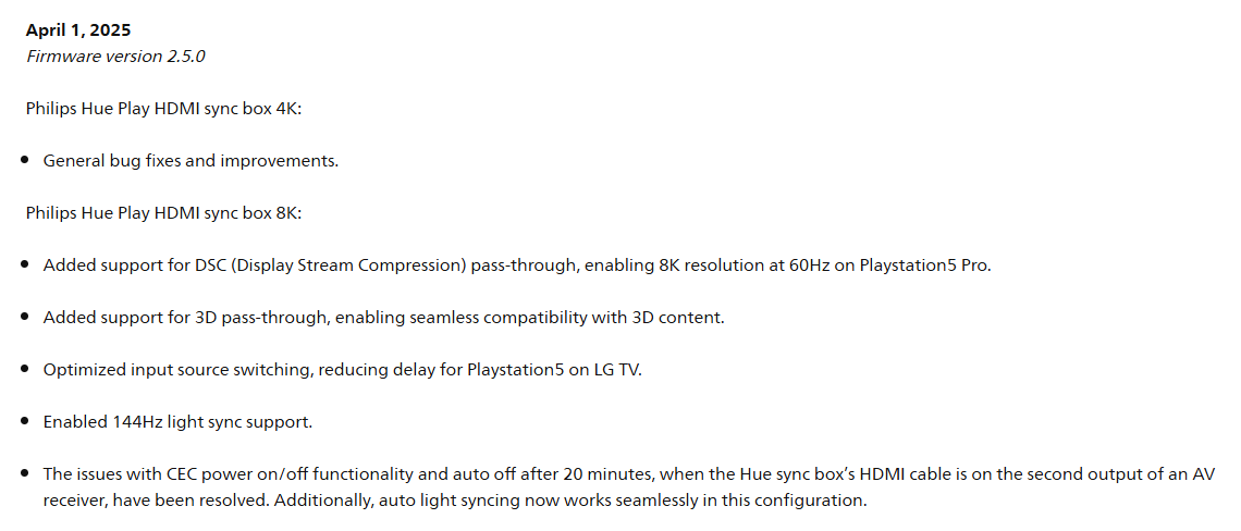 Una actualización de https://www.philips-hue.com/en-us/support/release-notes/philips-hue-play-hdmi-sync-box está lanzando la caja de sincronización Philips Hue Play HDMI 4K y la caja de sincronización Philips Hue Play HDMI 8K. Esta última se lanzó en octubre de 2024y ambos modelos se actualizados por última vez en diciembre.