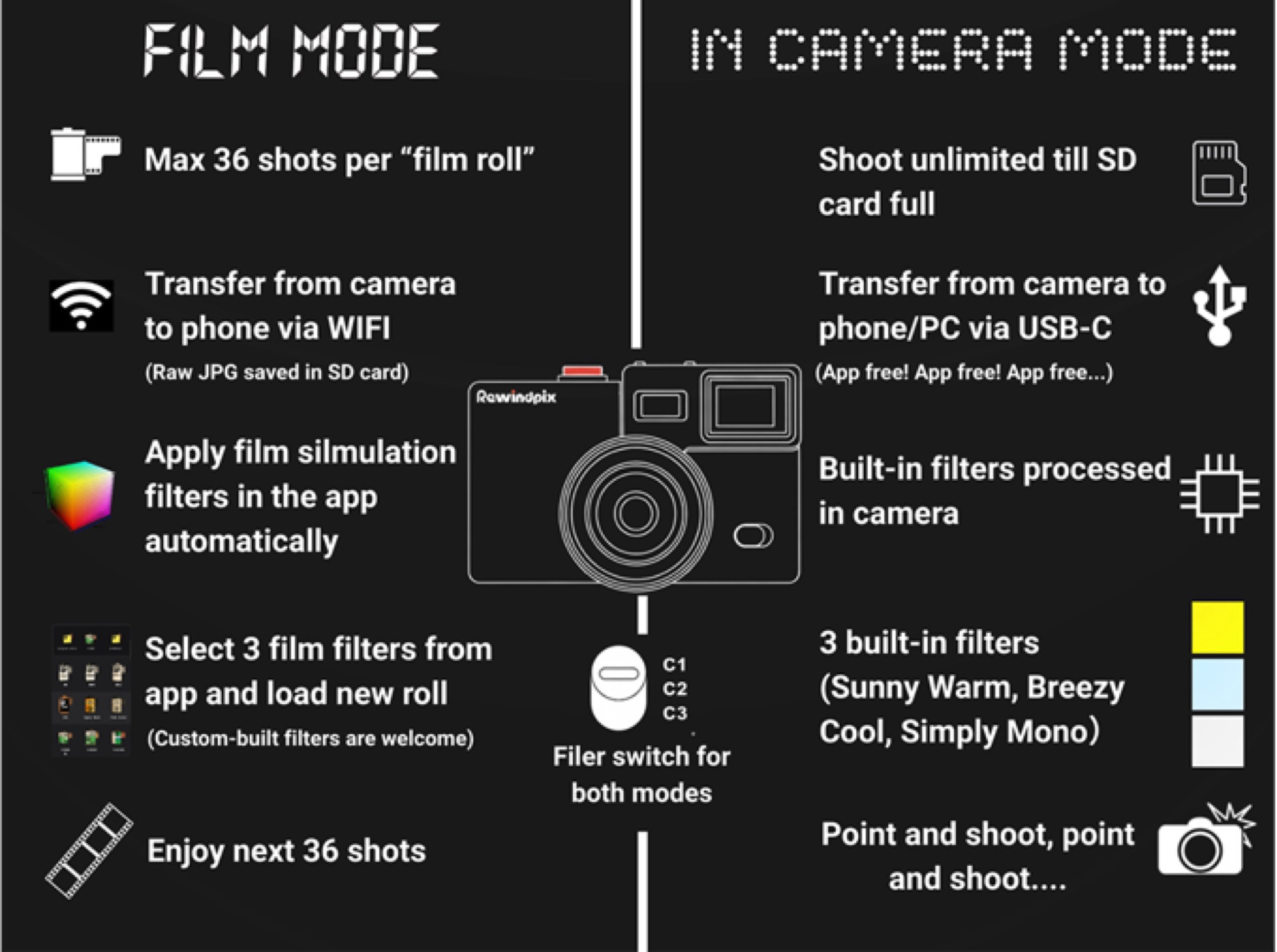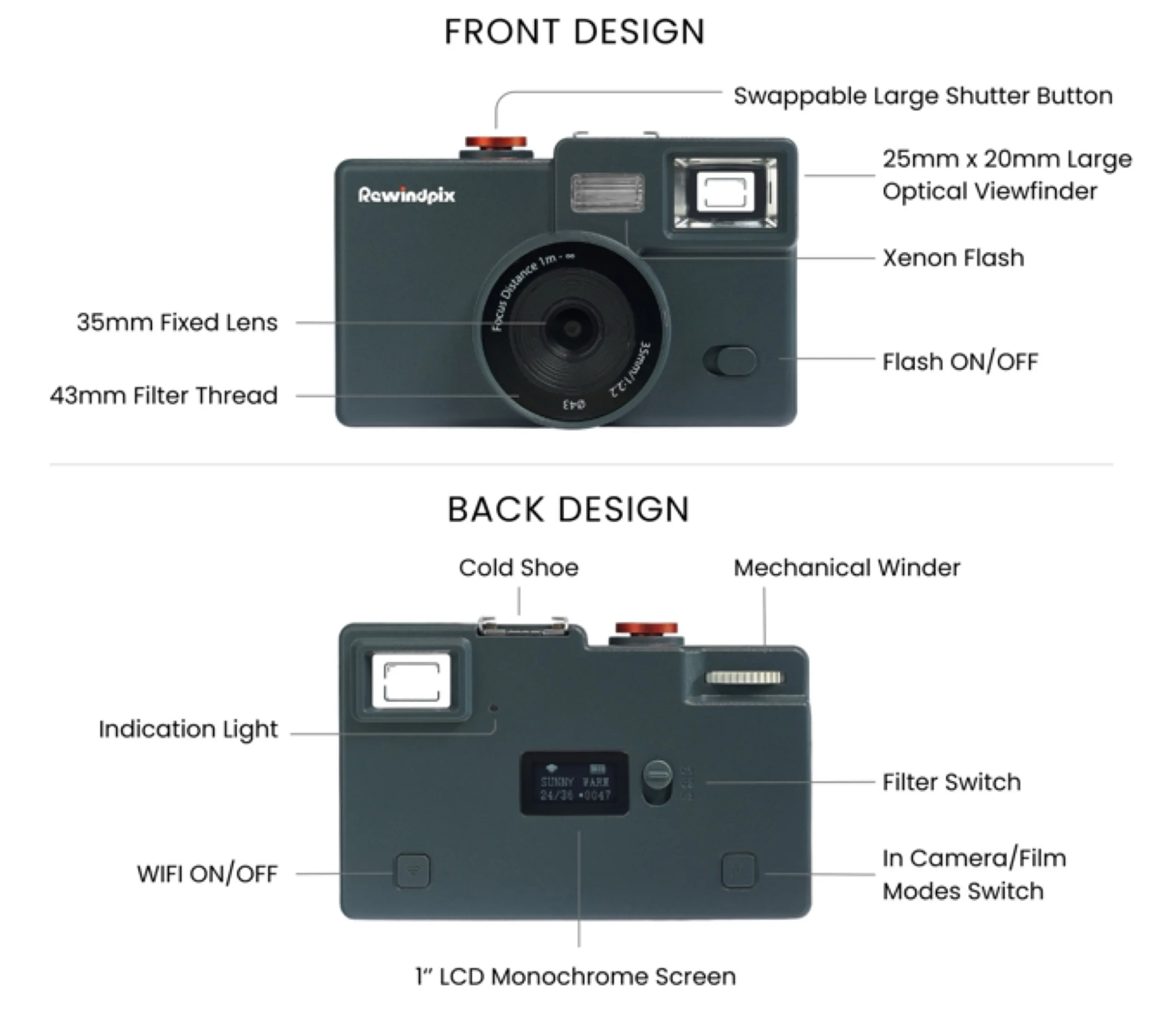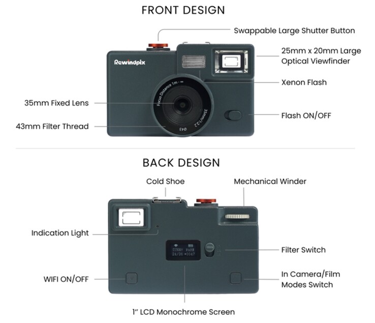 Después de que la Kodak Charmera fuera un rotundo éxito comercial, Rewindpix intenta aprovechar este éxito. Con un precio de 119 dólares, la cámara es un poco más cara, pero también debería conseguir una mejor calidad de imagen, ya que Rewindpix utiliza un sensor de 13 megapíxeles en formato de 1/3,06 pulgadas, que se combina con un objetivo de 35 mm f/2,2.
