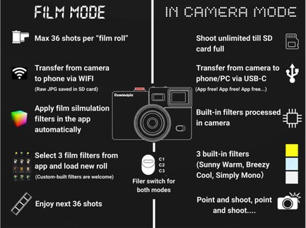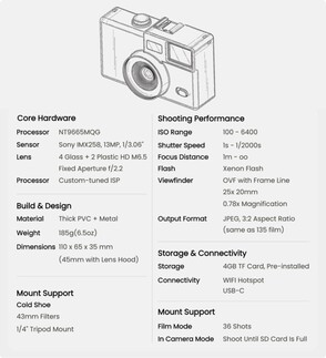 En segundo lugar, se pueden insertar rollos de película virtuales a través de la aplicación para smartphone asociada, que desbloquea un filtro y un número limitado de fotos. Las fotos sólo pueden verse una vez que se ha transferido todo el rollo de película al smartphone, para lo cual la cámara es compatible con Wi-Fi. Este "modo película" también puede desactivarse si se desea. Una pantalla de 1 pulgada en la parte trasera de la cámara de 185 gramos muestra detalles sobre la batería y la memoria disponible. En el volumen de suministro se incluye una tarjeta microSD de 4 GB.
