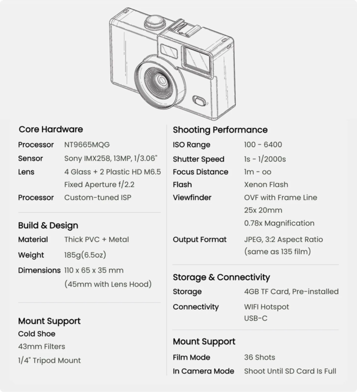 Las fotos no se toman a través de una pantalla, sino a través de un gran visor óptico. La exposición se ajusta automáticamente; los fotógrafos sólo tienen la opción de encender el flash si es necesario. La cámara está diseñada para capturar la sensación de una cámara analógica desechable. Para conseguirlo, el fabricante ha ideado dos características especiales en particular. En primer lugar, hay que "dar cuerda" a la cámara después de cada foto utilizando la rueda de la parte trasera