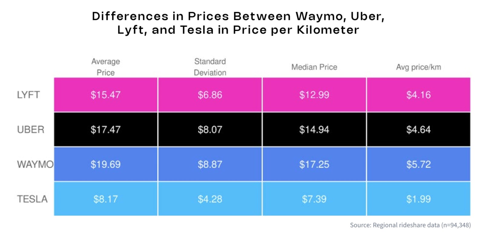 Según un estudio sobre el precio medio de los viajes compartidos, Tesla cobra sólo 1,99 dólares por kilómetro (3,20 dólares por milla), mientras que la tarifa media de Waymo es casi el triple. Se trata de una media de 94.348 trayectos en los que los datos incluyen tanto el precio del trayecto como los tiempos de espera del respectivo servicio de trayectos compartidos.