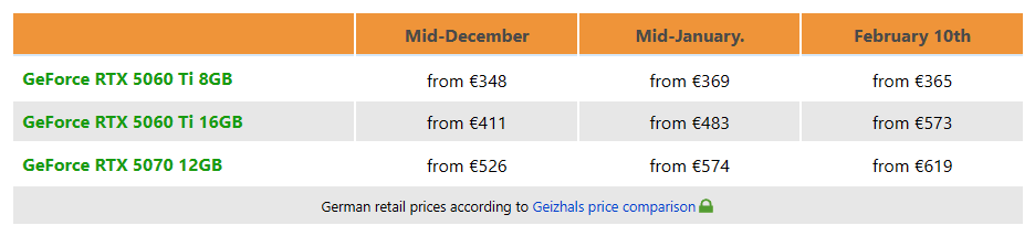 Mientras que la RTX 5060 Ti 16 GB se situaba supuestamente en 411 euros frente al precio de 526 euros de la RTX 5070 a mediados de diciembre, la RTX 5060 Ti 16 GB está ahora sólo 46 euros por detrás de la RTX 5070.