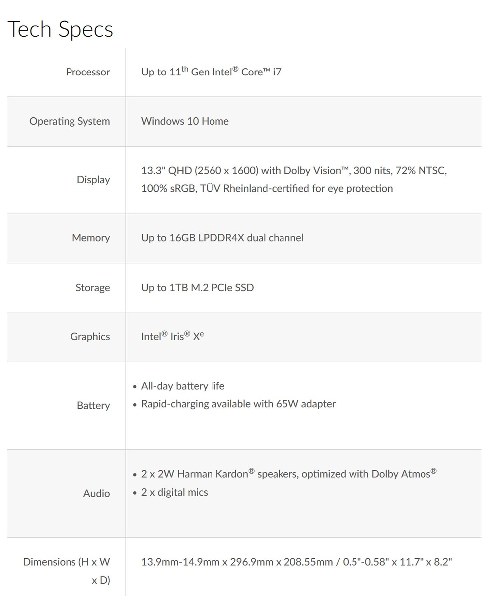 Llevando la marca de la serie Yoga Slim 7 que Lenovo anunció en agosto, el Yoga Slim 7i Carbon tiene una pantalla QHD de 13.3 pulgadas con 100% de cobertura sRGB y un brillo máximo de 300 nits. Según una página de productos en caché, Lenovo ofrecerá el dispositivo 16:10 con hasta 16 GB de RAM LPDDR4X y un SSD M.2 PCIe de 1 TB. A estos componentes se les añadirán procesadores "hasta la 11ª generación de Intel Core i7", lo que probablemente signifique el Core i7-1165G7 o el Core i7-1185G7. Esperamos que Lenovo venda al menos un Core i5 SKU, también.