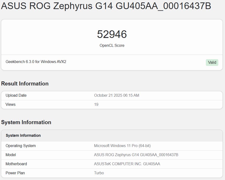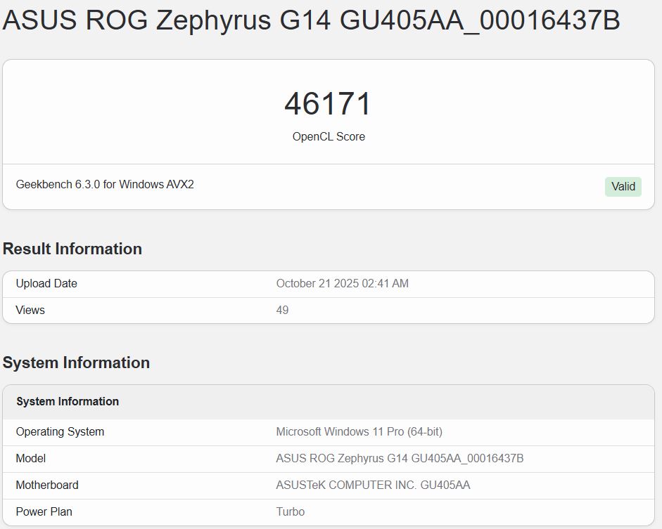 En el extremo más alto, la iGPU del Core Ultra X7 358H dentro del ROG Zephyrus G14 obtuvo una puntuación de 52.946 en el punto de referencia Geekbench 6.5 OpenCL. En el extremo inferior, la puntuación fue de 46.171. También hay otros listados con puntuaciones que caen entre estas dos cifras.