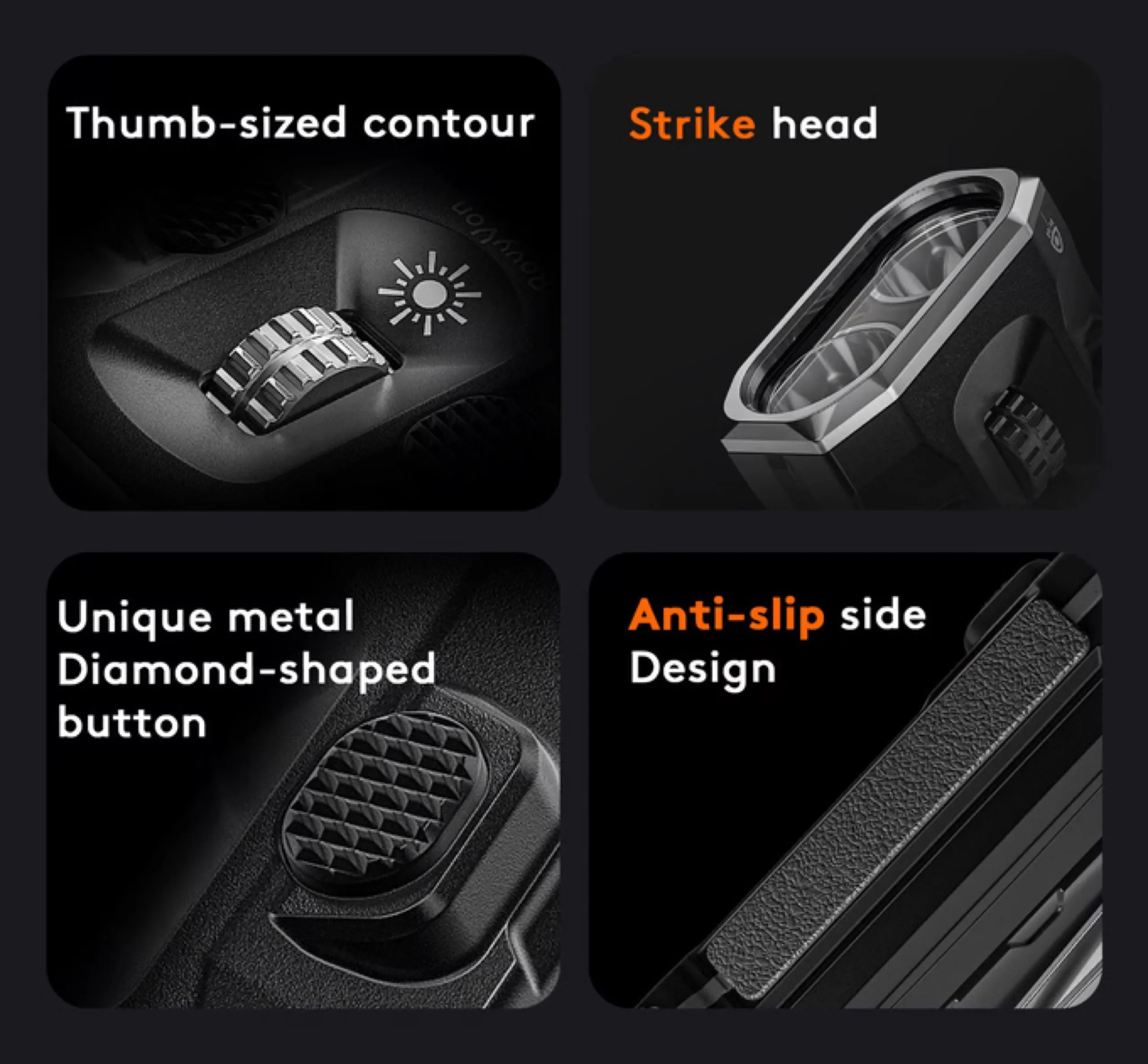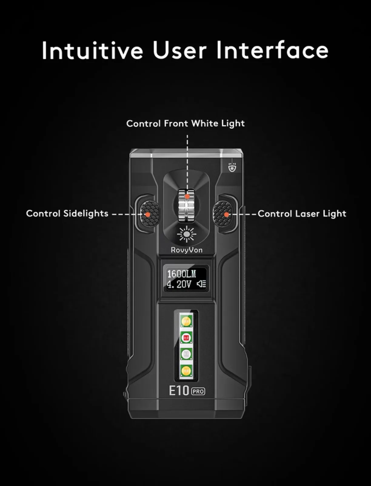 Una característica única es la rueda de desplazamiento, que le permite ajustar el brillo; pulsando sobre esta rueda se cambia entre los diferentes modos. El botón situado a la izquierda de la rueda de desplazamiento activa la "luz lateral", que se encuentra en la parte superior de la RovyVon E10 Pro, mientras que se encuentra en el lateral de la E10 Max, por lo demás idéntica y del mismo precio. Esta segunda luz puede utilizarse, por ejemplo, como luz de lectura blanca cálida o como señal roja de SOS.